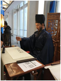 一进入会场首先看到穿着古装的机器人正在挥毫泼墨,这位留着黑色胡须、穿着古装的老先生以假乱真的本事不小,时不时还眨眨眼睛,皮肤和真人看上去极为相似。这就是"王阳明"仿真机器人,老先生对人们的要求来者不拒,一直在忙着给大家表演书法,"他"写的毛笔字盖上印章后,成为很多观众的收藏品。"老先生"的书法模仿了王阳明的字迹,还和王阳明一样,是位心理学家,能解答人们的心理问题!