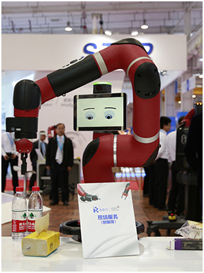 这款拥有两个中国红手臂的"小家伙"是由Rethink Robotics公司研发的Baxter智能协作机器人,是机器人大师Rodney Brooks的又一件作品。Baxter无所不能,不仅会装盒子、叠衣服,还会自拍!最重要的是,它是一名优秀的机器人"员工":在工厂,教什么会什么,学什么像什么,完全适应各种生产线,其独特的柔性身体构造还避免了在接触工人时对工人造成伤害。