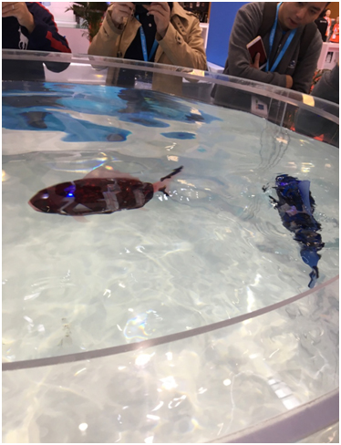 在会场,有一款仿生鱼机器人在水里游来游去引起人们关注,只见两条红色"锦鲤"在大玻璃缸里摇头摆尾,要不是鱼头上泛着的荧光有些蹊跷,几乎就能以假乱真。目前这款仿生鱼机器人主要以观赏为主,当然也可以接受一些水下作业,比如拍照、测水质等。目前机器人鱼并没有量产,只接受定制,大小、鱼种都可以改变,甚至连鲨鱼也能定制!