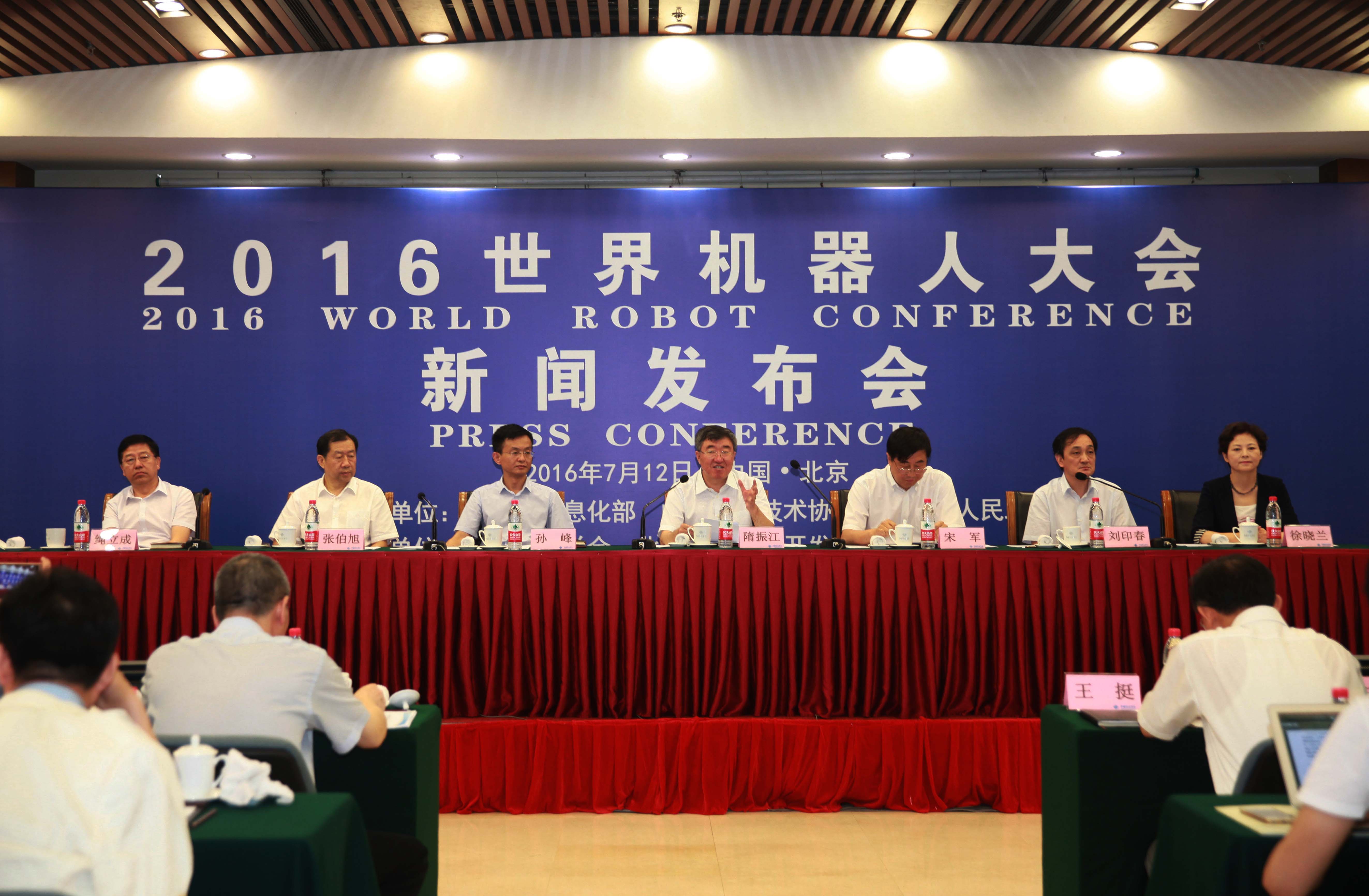 7月12日,2016世界机器人大会新闻发布会在中国科技会堂召开,北京市人民政府副市长隋振江,中国科协党组成员兼学会学术部部长、企业工作办公室主任宋军,工业和信息化部装备工业司副司长孙峰,北京市人民政府副秘书长刘印春,北京市经济和信息化委员会主任张伯旭,2016世界机器人大会秘书长、中国电子学会副理事长兼秘书长徐晓兰,北京经济技术开发区管委会副主任绳立成等出席了新闻发布会。发布会由北京市人民政府副秘书长刘印春主持。