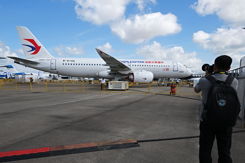 2月20日,一架中国东方航空公司C919客机在新加坡航展上做静态展示。