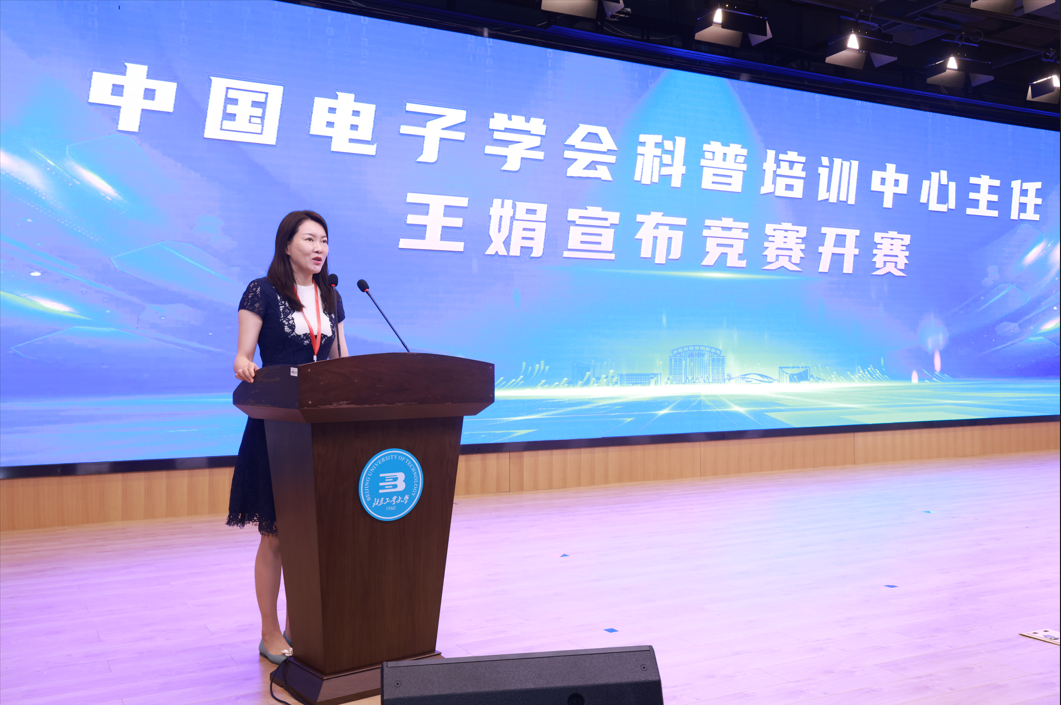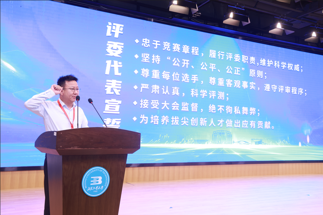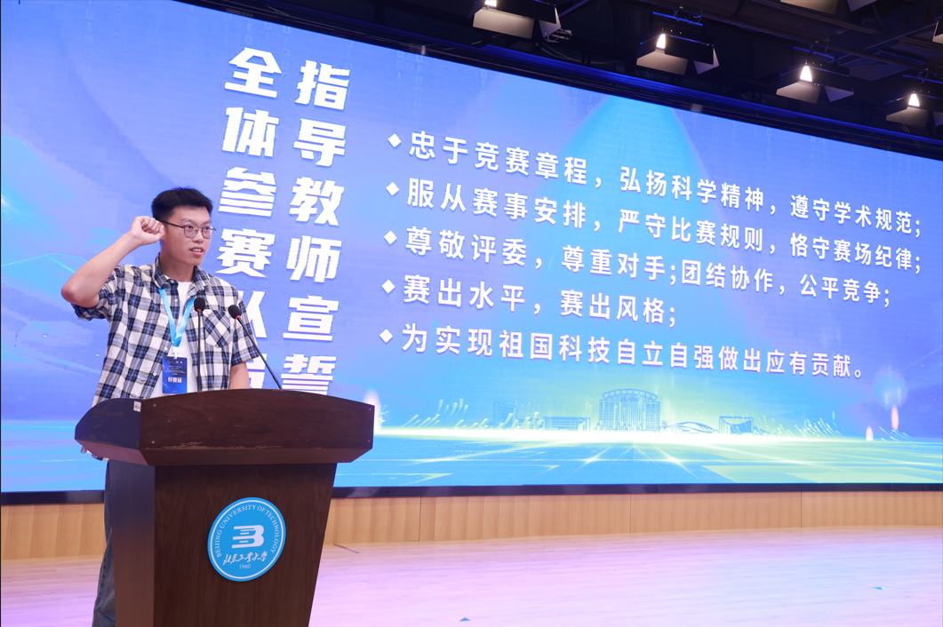 李建荣副校长、曹学勤副秘书长分别致辞。研电赛华北赛区评委代表、北京邮电大学杨少石教授代表专家评委宣誓。北京工业大学信息学部博士生廖诣深带领全体参赛师生宣誓。中国电子学会科普培训中心主任王娟宣布复赛开赛。