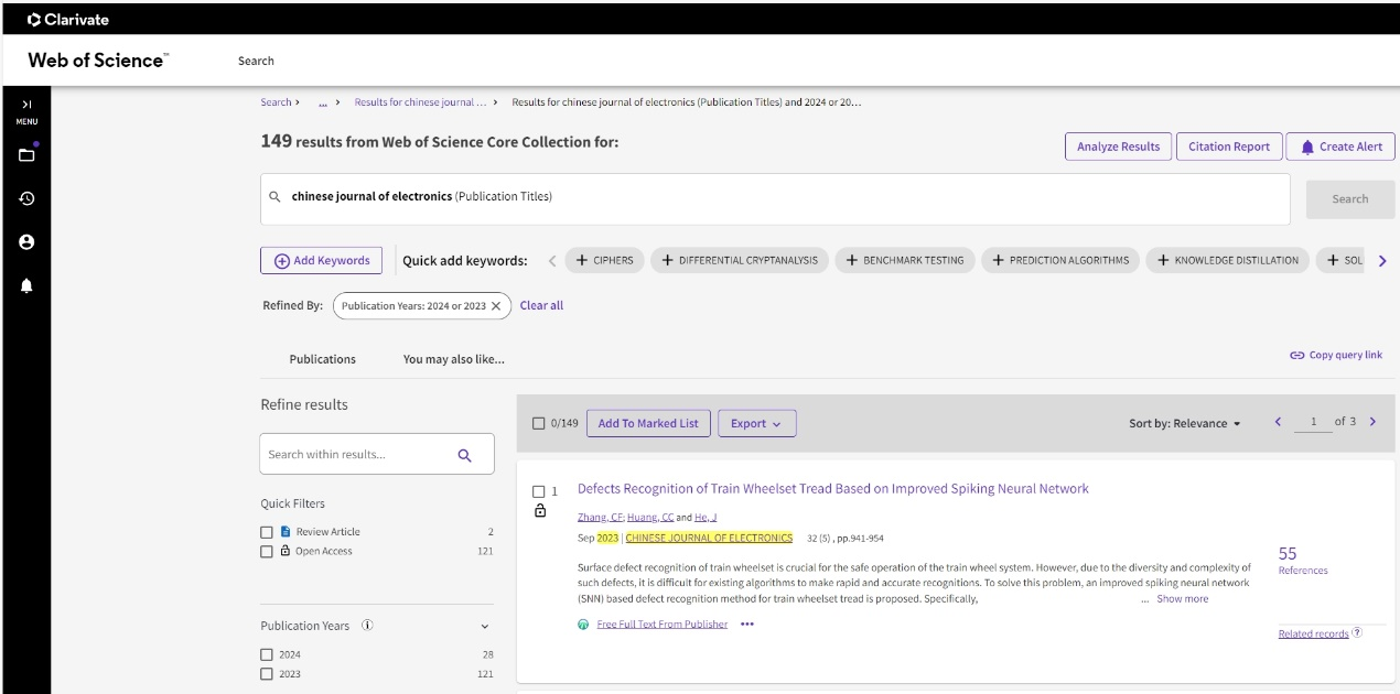 Chinese Journal of Electronics (即《电子学报(英文)》) 2023年5,6期及2024年1期现已被Web of Science数据库收录,欢迎广大读者专家前往检索。