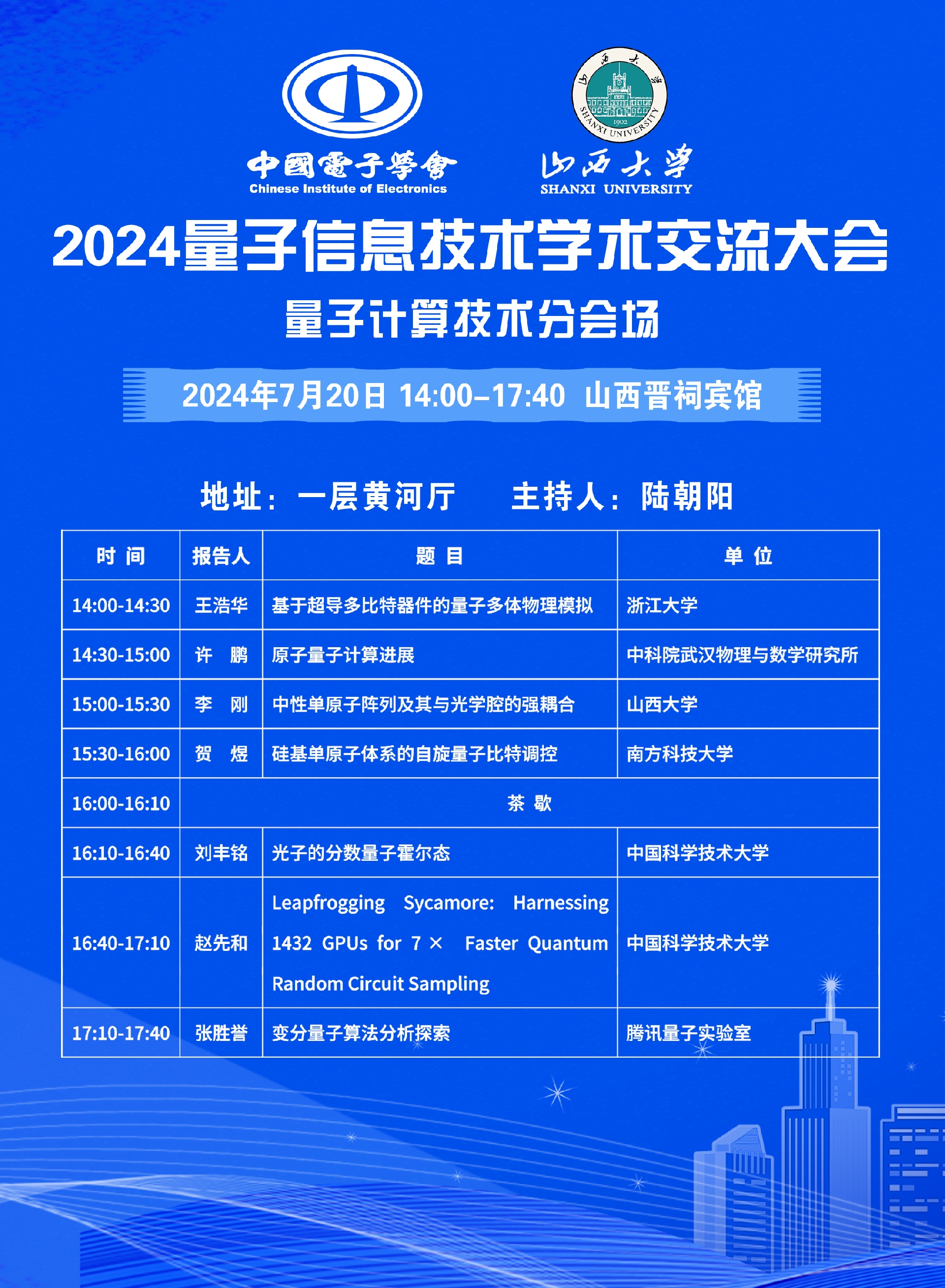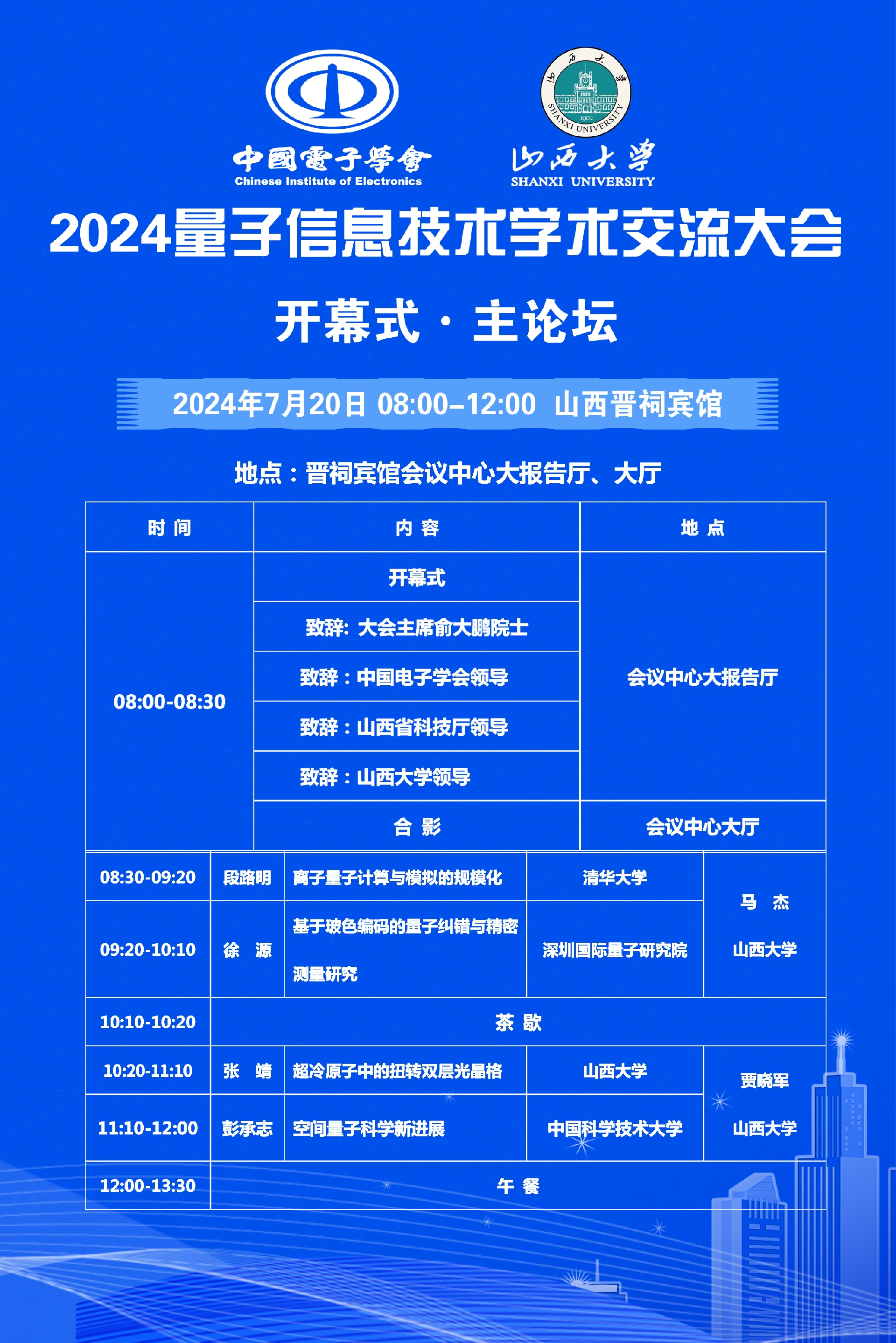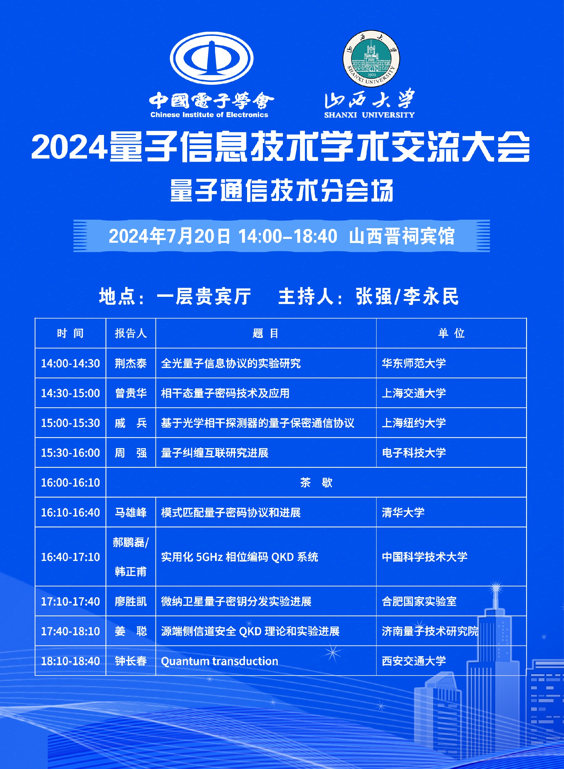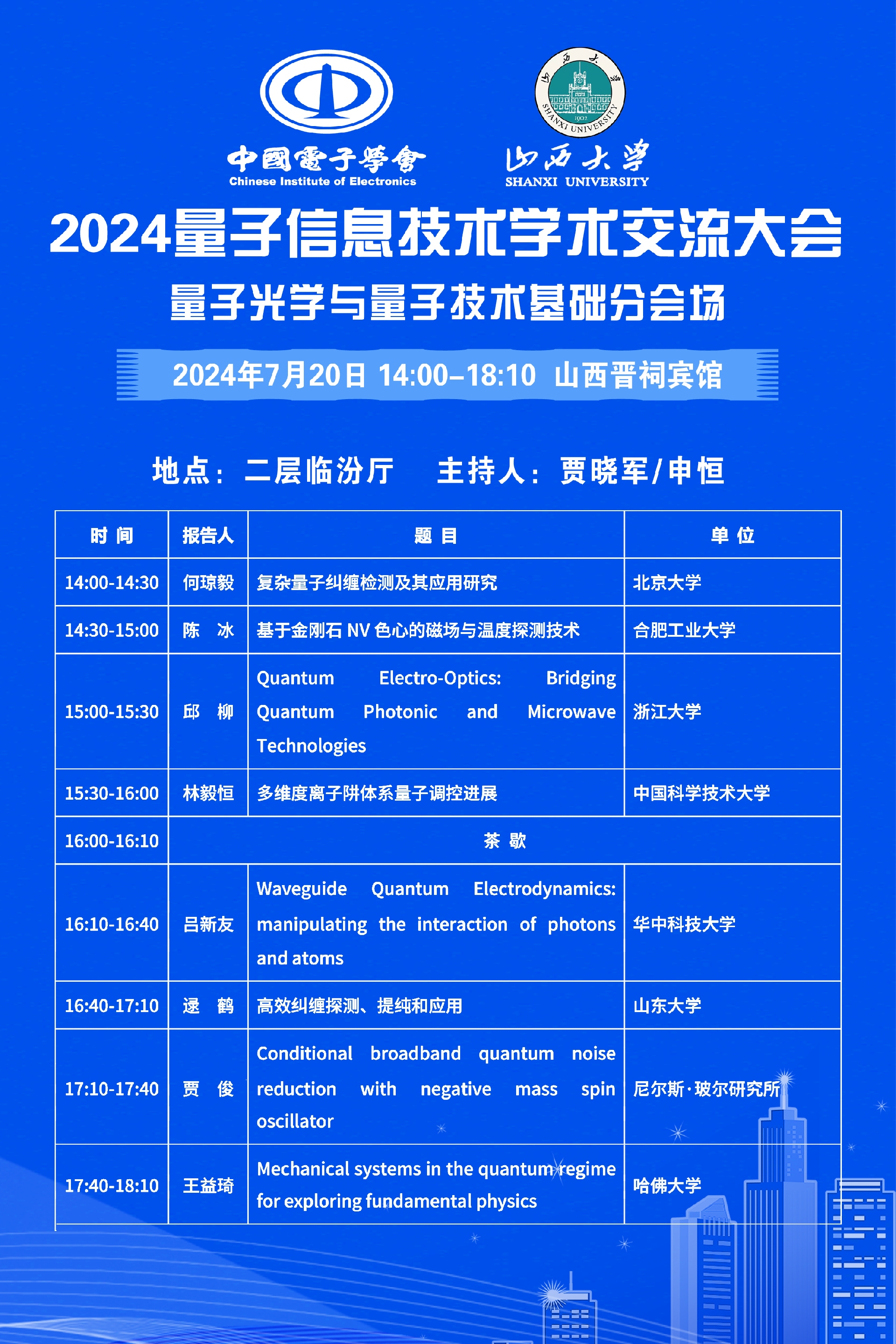 由中国电子学会量子信息分会联合量子光学与光量子器件国家重点实验室(山西大学)主办的2024量子信息技术学术交流大会即将于2024年7月20日(19日中午开始报到)在山西太原晋祠宾馆举行。本次大会汇聚了业内院士、专家学者、企业代表和技术精英,共同探讨量子信息技术发展趋势和未来方向,大会由1个主会场和8个分会场组成,详细议程请滑动查看~