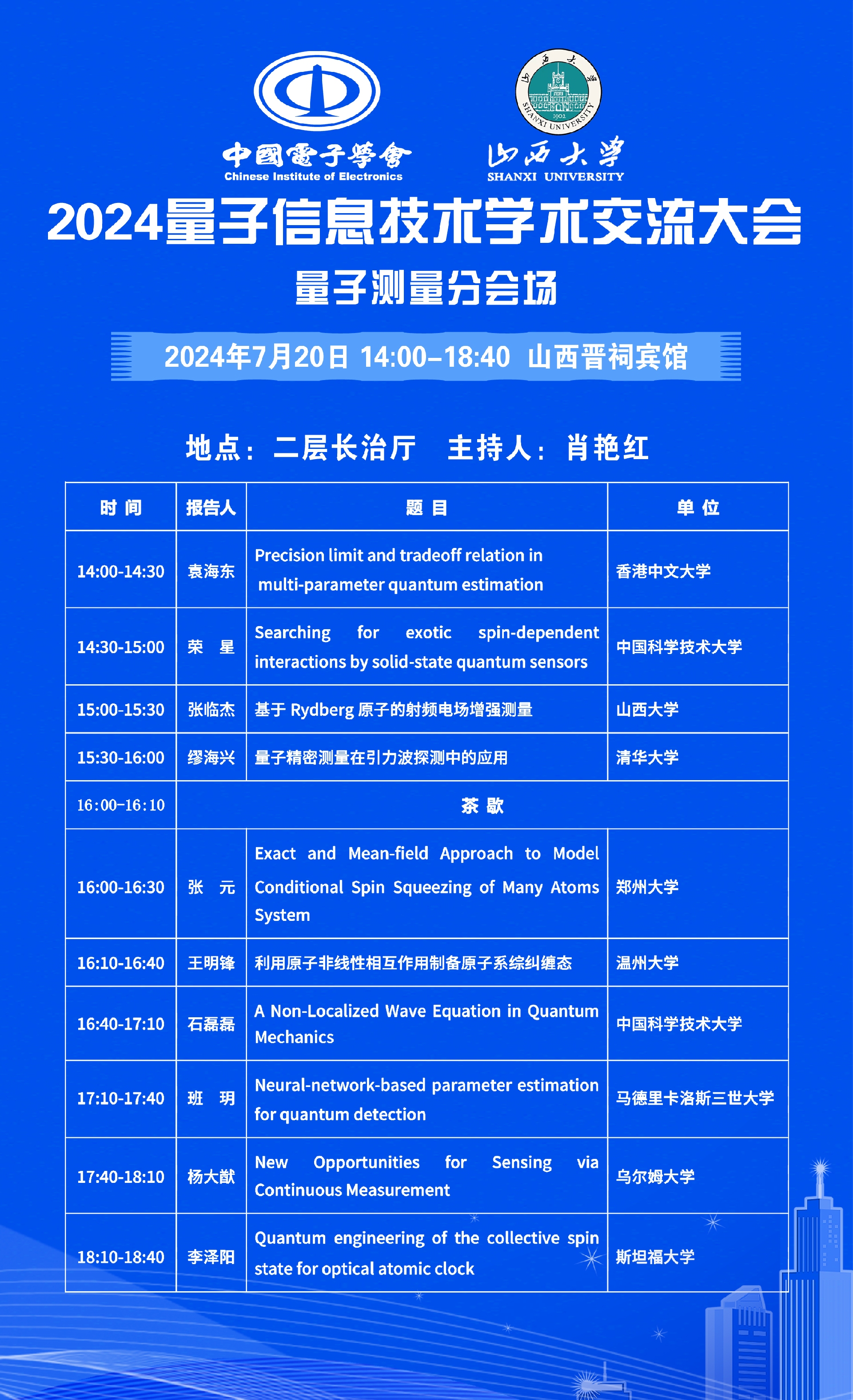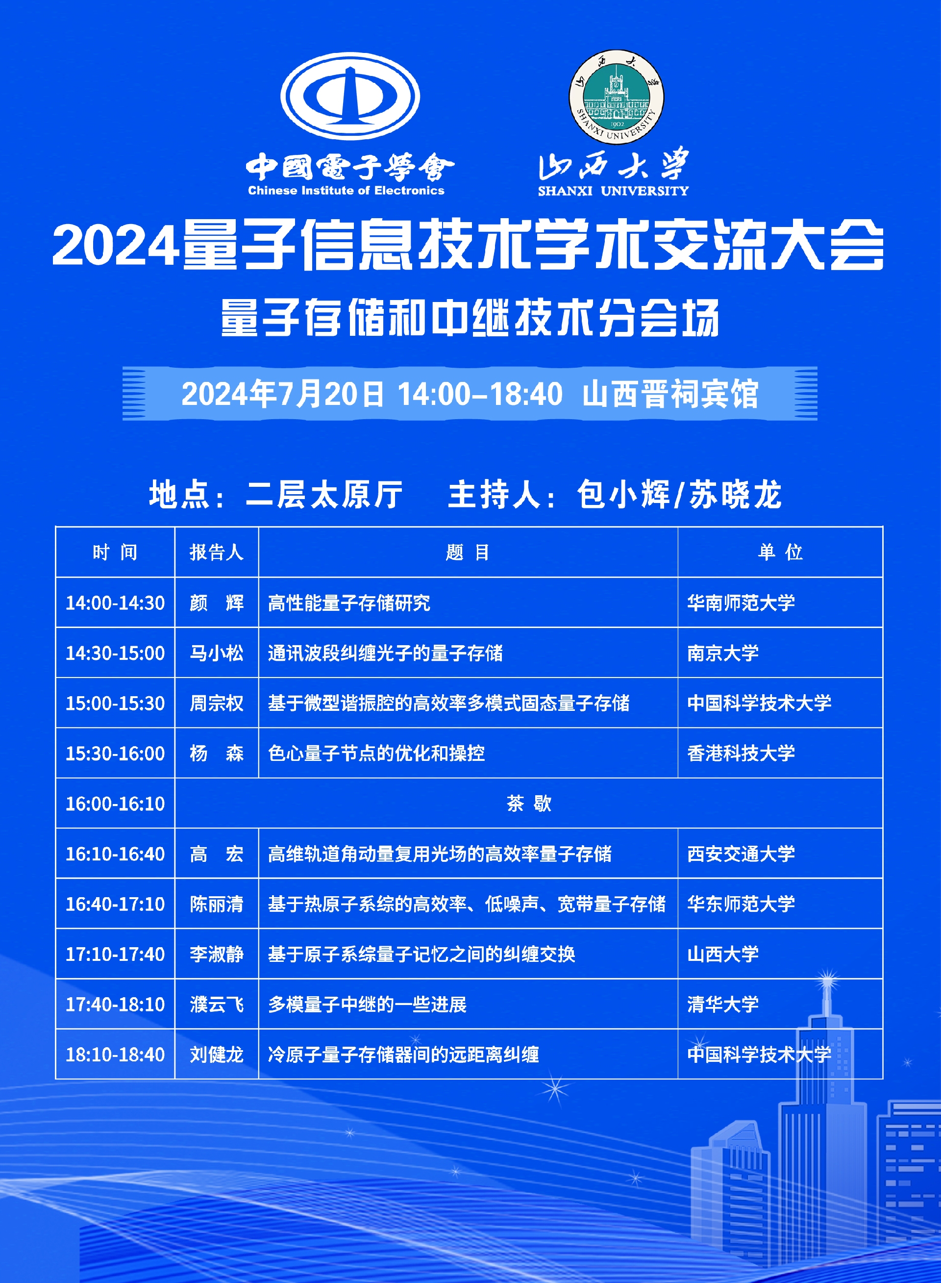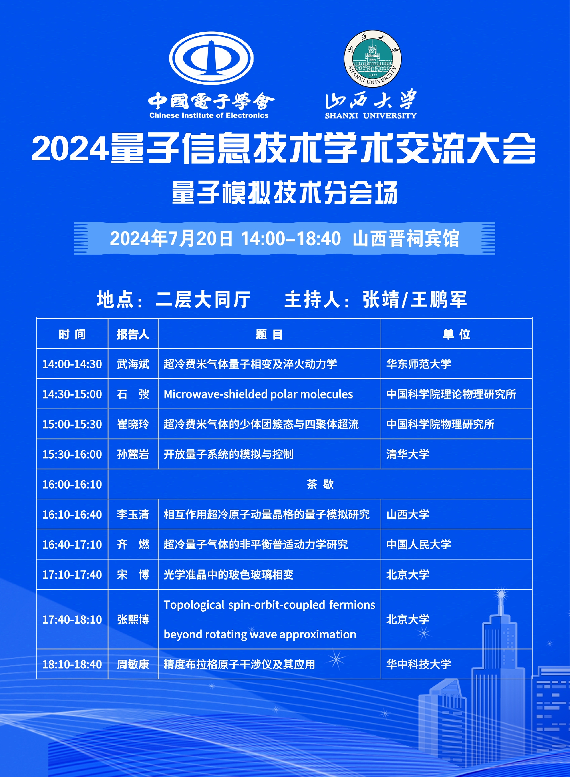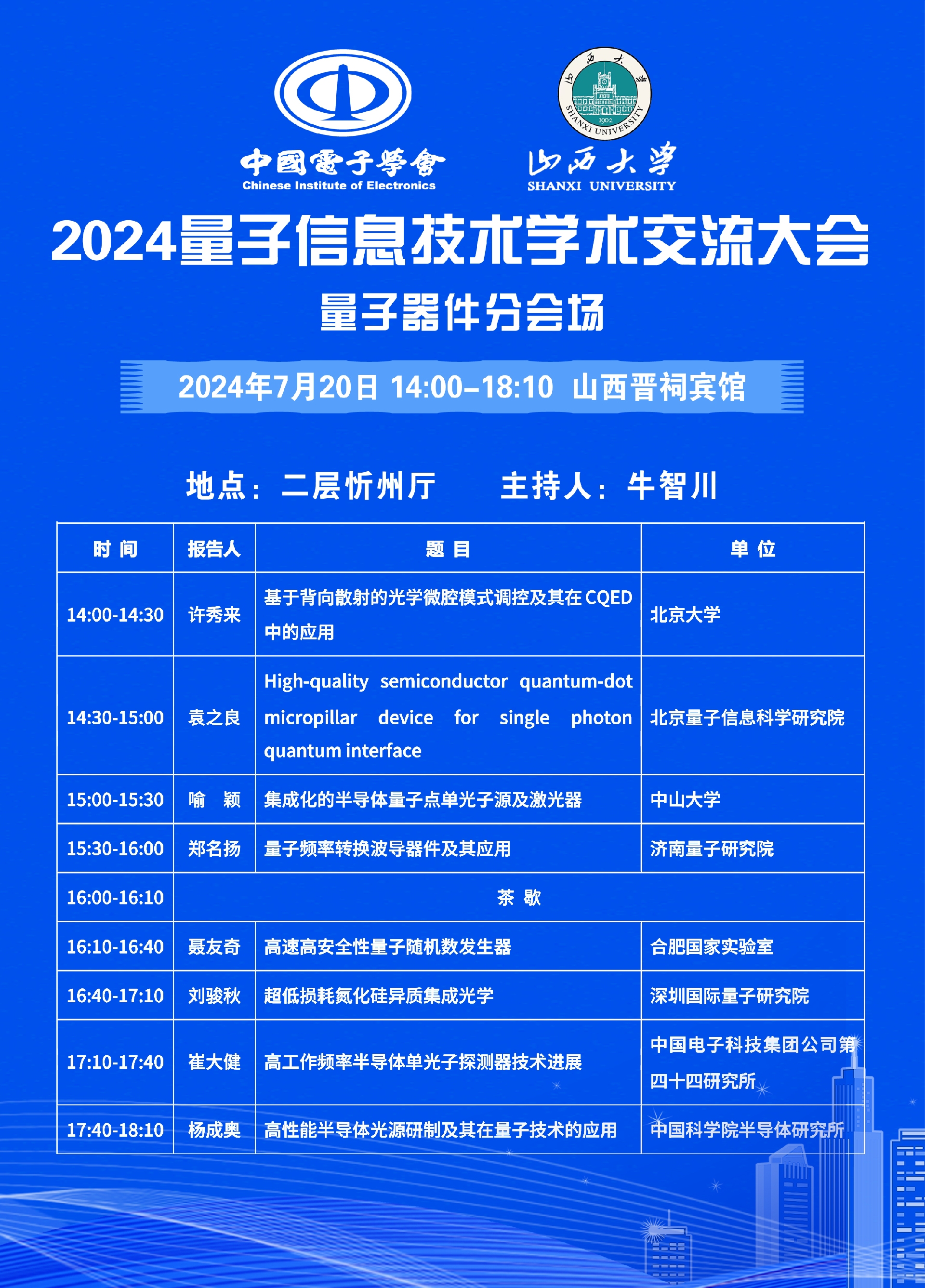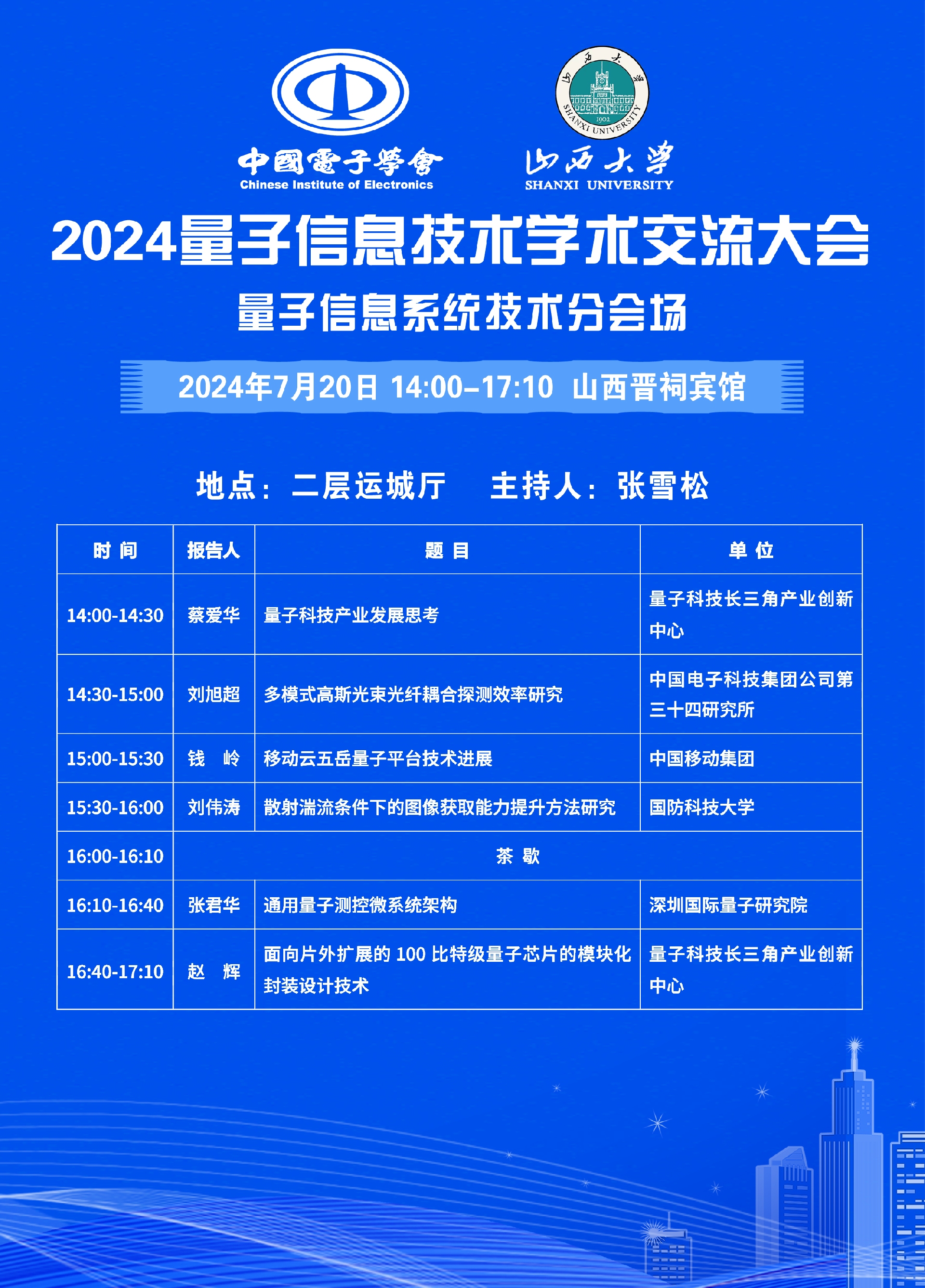 由中国电子学会量子信息分会联合量子光学与光量子器件国家重点实验室(山西大学)主办的2024量子信息技术学术交流大会即将于2024年7月20日(19日中午开始报到)在山西太原晋祠宾馆举行。本次大会汇聚了业内院士、专家学者、企业代表和技术精英,共同探讨量子信息技术发展趋势和未来方向,大会由1个主会场和8个分会场组成,详细议程请滑动查看~