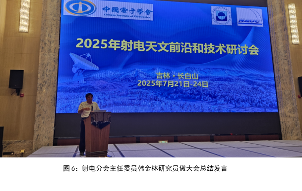 23日下午,中国电子学会射电天文分会主任委员韩金林研究员做大会总结发言。他首先感谢上海天文台长白山站李斌研究员及其团队对本次活动的鼎力支持,感谢洪涛副总干事等同志对会务工作的周密安排和辛勤劳动。韩金林表示,射电天文分会本质上是群众组织,宗旨就是为会员服务,利用研讨会平台为大家提供各种信息交流和分享机会,会议期间开展会员日活动,参观长白山40米射电望远镜,希望能帮助大家加强合作,充分利用国内先进的观测设备做出研究成果。大家理解了科学成果和技术进步背后的辛苦,如刘铁报告的利用天马望远镜开展的谱线搜寻新分子、苏扬等坚持10年利用德令哈望远镜开展银河画卷巡天。大家在技术层面也明显在努力和进步,比如陈林杰在明安图开展的MUSER-L射电日像仪校准测量、张利在消除观测效应方面的各种尝试等等。各路技术人才也都利用“射电天文前沿与技术研讨会”机会,促进科学和技术的结合,优化改进望远镜系统的每一个细节,改进效率、指向、相位等指标,给大家奉献最优的、国际领先的射电望远镜。