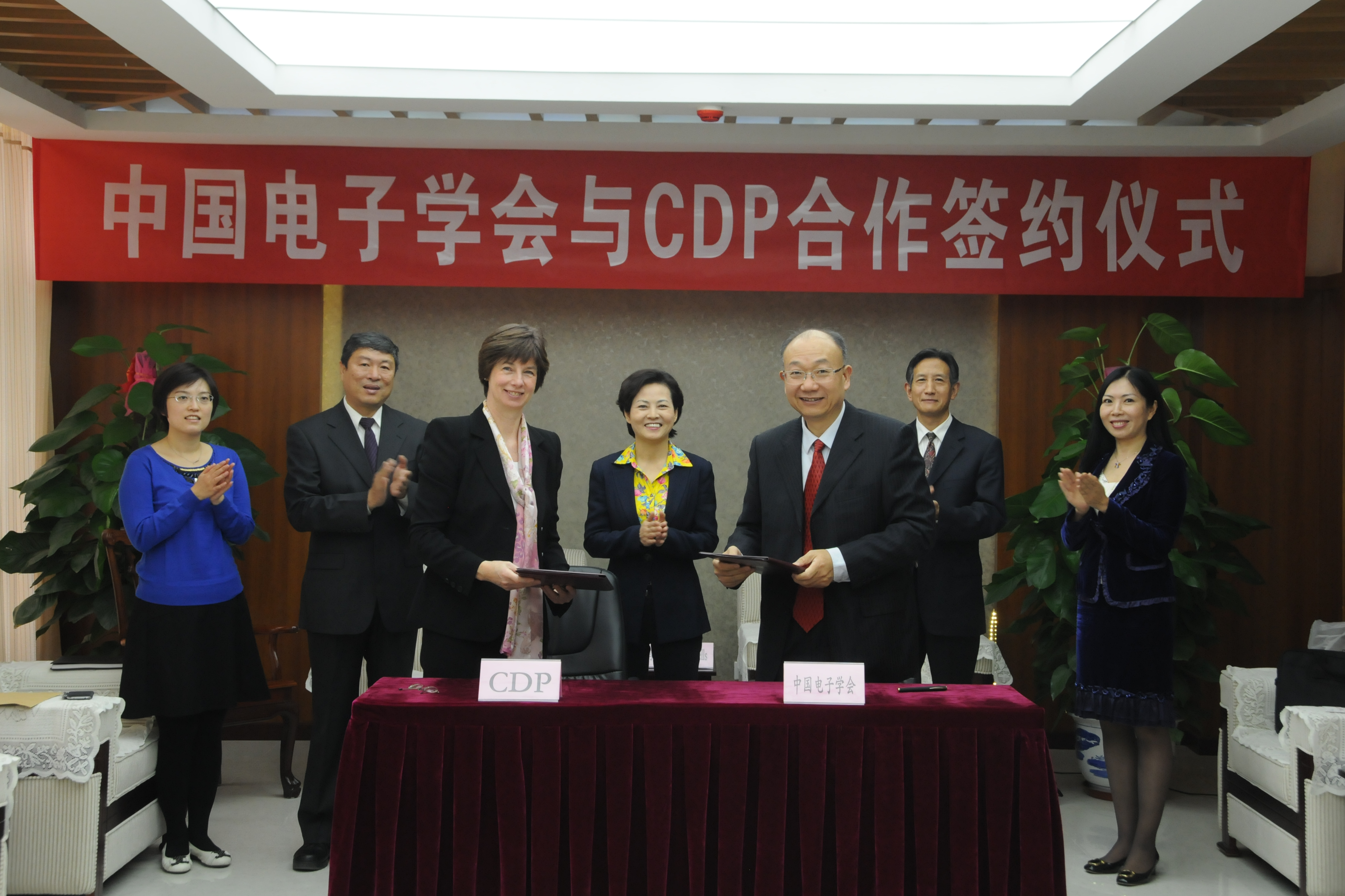 2014年10月27日,中国电子学会副理事长周子学、秘书长徐晓兰、副秘书长李军宁和咨询师王妍博士一行四人参加了由意大利国际性非盈利组织CDP举办的研讨会议。中国电子学会秘书长徐晓兰对中国电子学会的主要业务和所从事的节能减排工作进行了介绍。CDP全球业务运营官Sue Howells对其如何进行碳排放交易管理进行了介绍。双方就节能减排项目推广、低碳工业园区和生态智慧区域建设,以及数据中心分布式供能方面进行探讨。最终,双方达成一致意见,将在以上领域开展合作,中国电子学会副理事长周子学代表中国电子学会同CDP签署了战略合作备忘录。