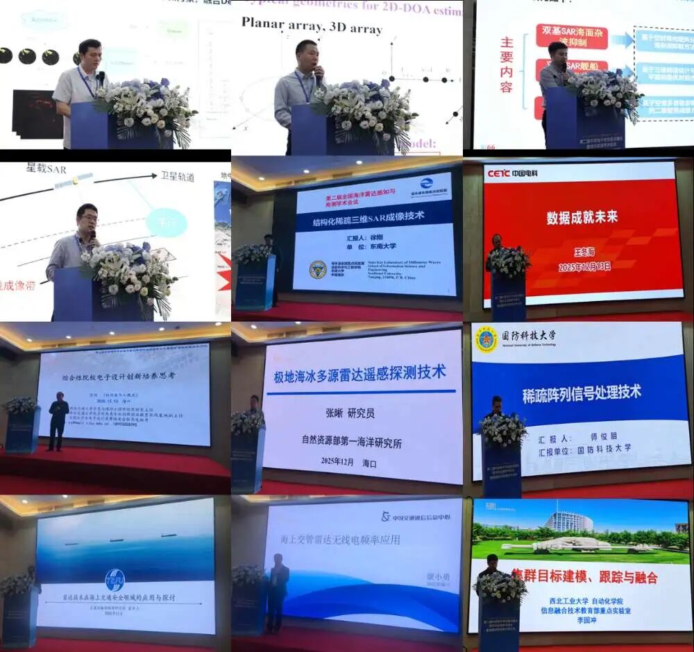 在主题报告环节,会议邀请了全球海洋雷达感知与监测领域的顶尖专家学者,分享了关于海洋雷达技术最新研究成果和应用进展的精彩报告。清华大学的谷源涛教授就“从理论支撑到数据驱动——浅谈信号处理方法发展”进行了详细阐述,介绍了信号处理技术从传统模型驱动到现代数据驱动的演进路径,及其在提升海洋雷达探测精度与智能化水平方面的突破性应用。西安电子科技大学许述文教授关于“雷达回波图结构表征及其在对海目标检测中的应用”的最新成果。电子科技大学李中余教授关于“双基地SAR对海舰船成像新进展”的报告,介绍了双基地合成孔径雷达在复杂海况下对运动舰船目标的高分辨率成像关键技术突破及多角度协同观测带来的探测效能显著提升成果。此外,海军航空大学陈小龙教授、自然资源部第一海洋研究所张晰研究员、北京理工大学王岩教授、三峡大学文方青教授、西安交通大学符均高工、东南大学徐刚教授、中国电科电子科学研究院王冬海研究员、国防科技大学师俊朋教授、西北工业大学李固冲副教授、交通运输部规划研究院易中立首席研究员、中国交通通信信息中心康小勇高工等专家,分别以深入浅出的方式讲解了相关技术前沿,为与会者提供了丰富的学术参考与实践经验。