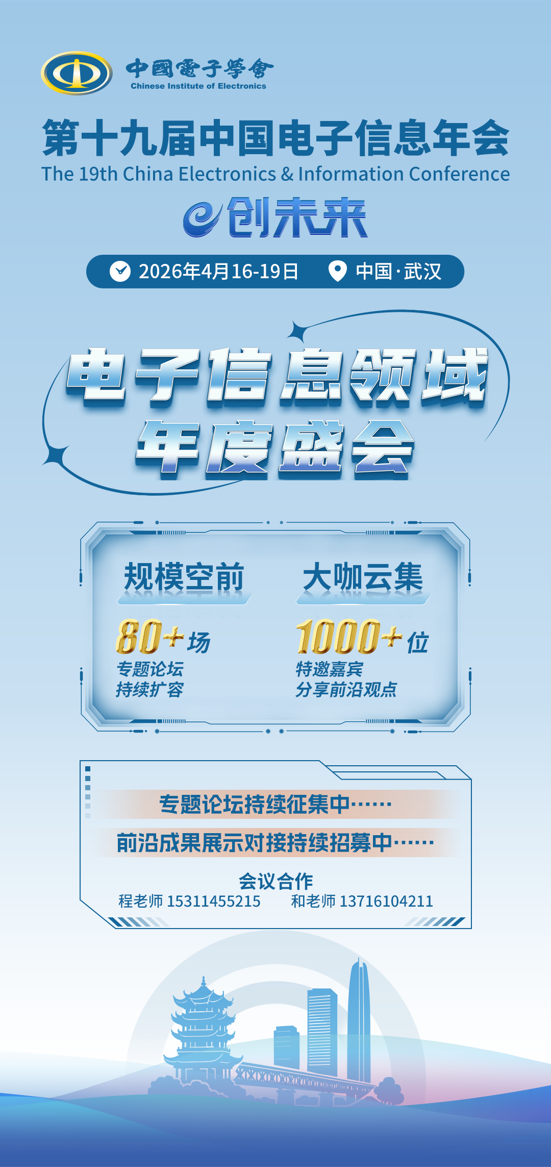 中国电子信息年会现已成功举办十八届,成为我国电子信息领域技术交流与产业推进的高层次、综合性学术盛会。第十九届中国电子信息年会将于2026年4月16-19日在湖北省武汉市光谷科技会展中心举行。会议秉承“创·聚·服”宗旨,聚焦“e创未来”主题,旨在汇聚广大电子信息领域科技工作者,围绕世界前沿科技、国家战略需求、产业研究热点,紧扣国家“十五五”电子信息产业规划,结合地方科研需求和产业布局,邀请高等院校、科研院所、龙头企业等多方代表,以2场主论坛、80场专题论坛、2025中国电子学会奖励大会以及电子信息科技成果展示等多种形式,开展学术交流,促进产业融合。