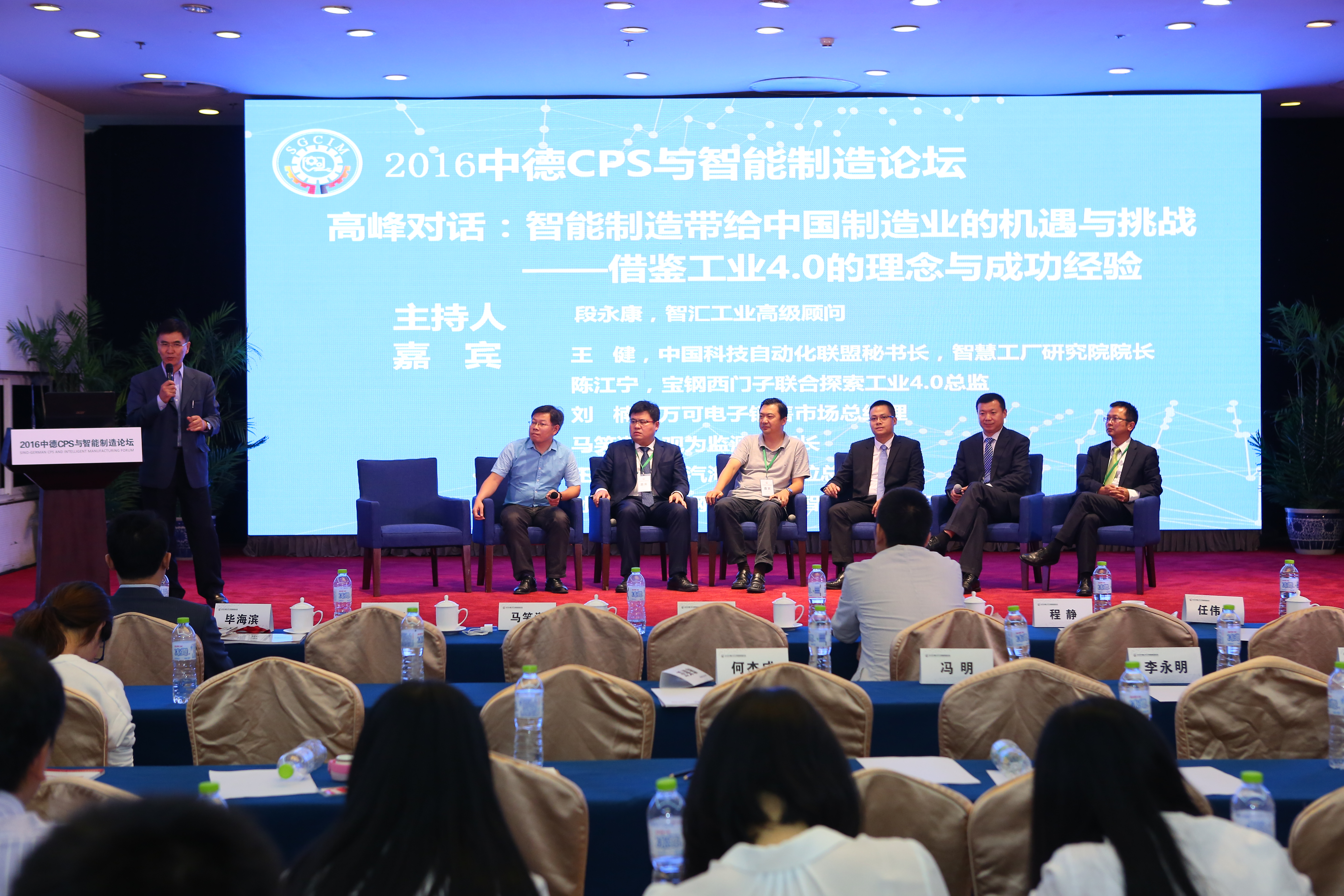 高峰对话环节由智汇工业高级咨询顾问段永康先生主持,主题为"中德智能制造合作的机遇与挑战"。中国科技自动化联盟秘书长、智慧工厂研究员院长王健,宝钢西门子联合探索工业4.0总监陈江宁,万可电子销售市场总经理刘楠,观为监测董事长马笑潇,北汽海纳川海拉总经理王发浩,南钢金恒信息智能化副总监孙敬忠作为嘉宾共同探讨了如何借鉴工业"4.0"理念与成功经验助力中国制造业,智能制造带给中国制造业的机遇与挑战。