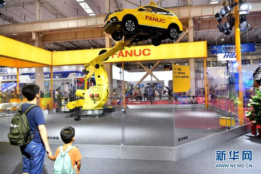 8月15日,参观者在博览会上观看一款超大机器人整车搬运系统。 新华社记者 李鑫 摄