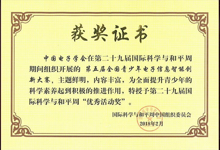 2018年2月25日上午,在第五届全国青少年电子信息智能创新大赛--电子控制赛的决赛现场,由"国际科学与和平周"中国区组委会秘书长陈一雄先生,向大赛主办方--中国电子学会的代表颁发了第二十九届"国际科学与和平周"优秀活动奖。