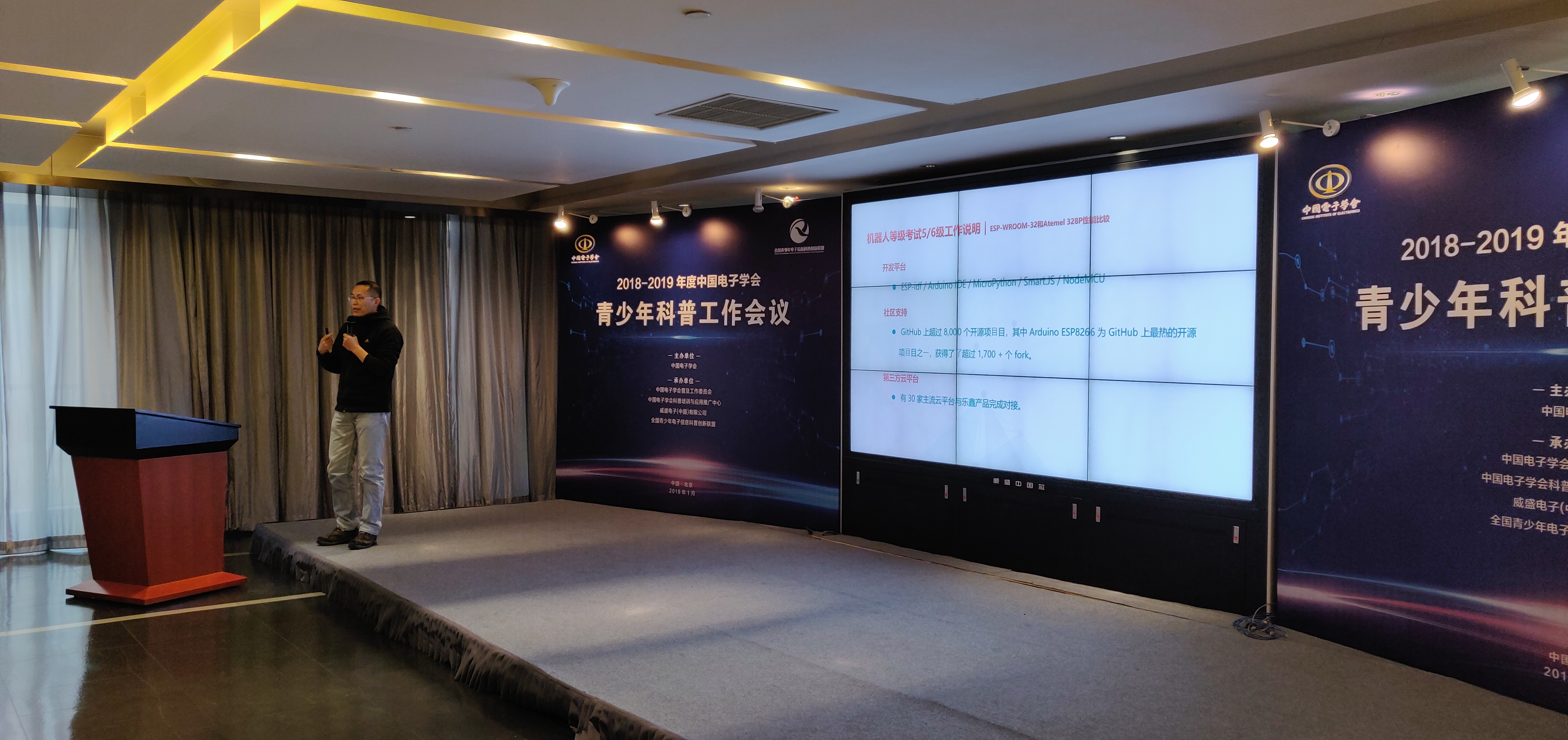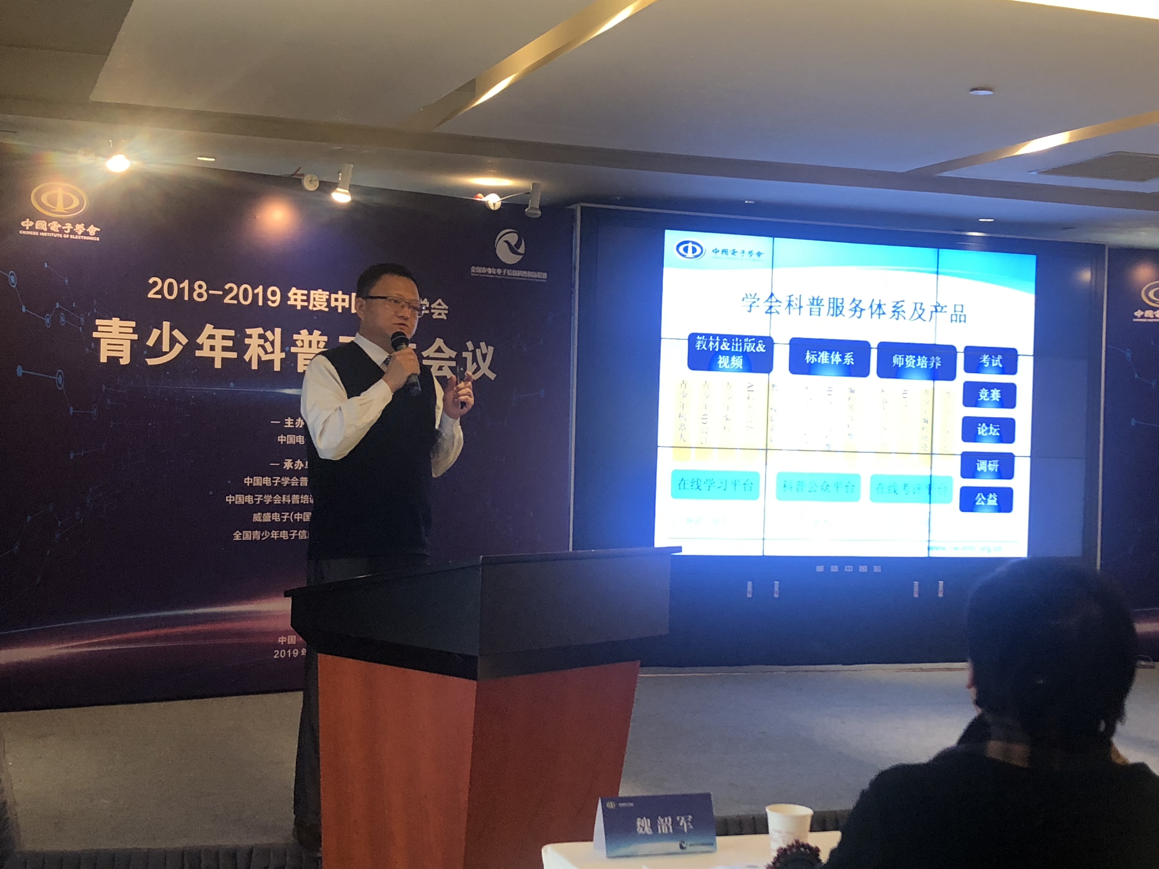中国电子学会普及工作委员会副秘书长杨晋代表学会做了2018年科普工作总结和2019年科普工作计划。2019年学会将面向世界智能大会、世界机器人大会、全国科普日、四个等级考试和一项青少年智能创新大赛等工作全面启动相关工作。