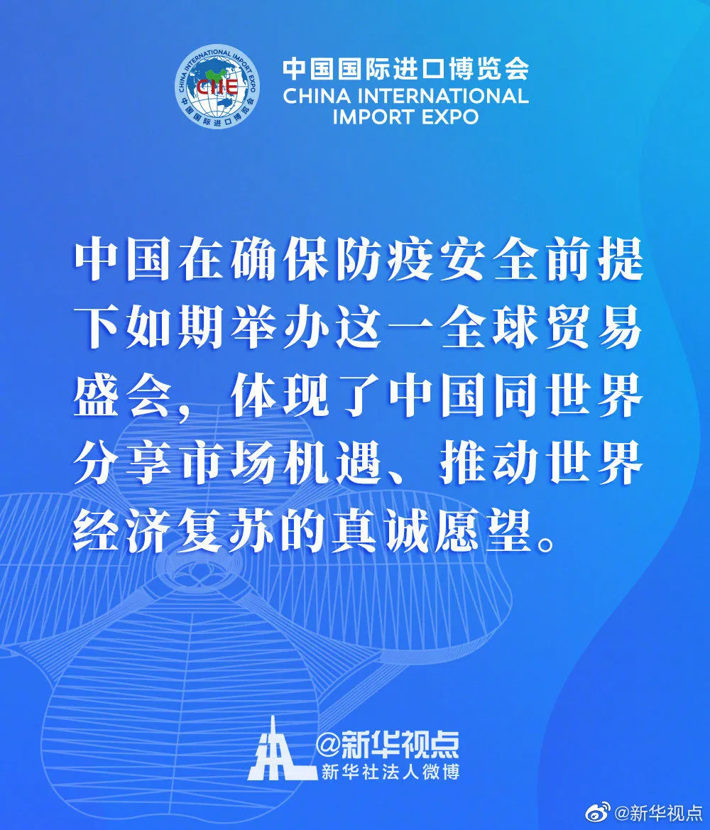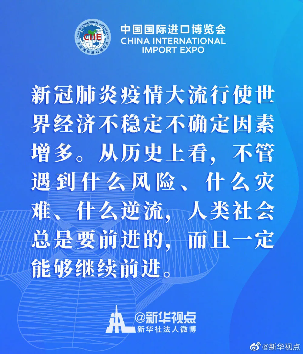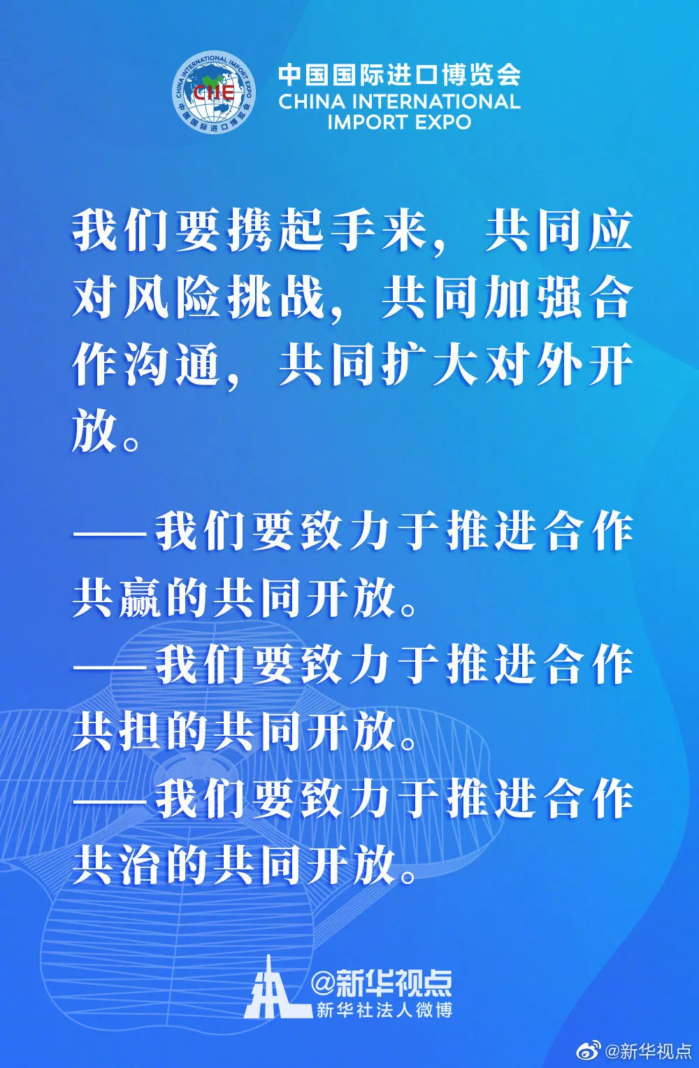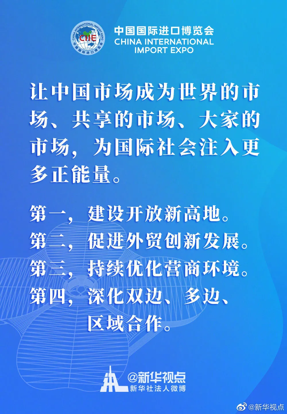 习近平指出,本届进博会是在特殊时期举办的。突如其来的新冠肺炎疫情给各国带来严重冲击,也给世界经济带来重创。中国在确保防疫安全前提下如期举办这一全球贸易盛会,体现了中国同世界分享市场机遇、推动世界经济复苏的真诚愿望。 习近平强调,尽管受到疫情影响,今年中国扩大开放的步伐仍在加快。我在第二届进博会上宣布的扩大对外开放系列举措已经全面落实。中国持续扩大进口。海南自由贸易港建设总体方案、深圳进一步扩大改革开放的实施方案发布实施,商签高标准自由贸易协定、培育进口贸易促进创新示范区、保护知识产权、高质量共建“一带一路”等举措都取得了积极进展。 习近平指出,疫情使世界经济不稳定不确定因素增多。从历史上看,不管遇到什么风险、什么灾难、什么逆流,人类社会总是要前进的,而且一定能够继续前进。各国走向开放、走向合作的大势没有改变。我们要携起手来,共同应对风险挑战,共同加强合作沟通,共同扩大对外开放。要致力于推进合作共赢的共同开放,信任而不是猜忌,携手而不是挥拳,协商而不是谩骂。要致力于推进合作共担的共同开放,大国要率先示范,主要经济体要以身作则,发展中国家要积极作为。要致力于推进合作共治的共同开放,不应该任由单边主义、保护主义破坏国际秩序和国际规则,而要以建设性姿态改革全球经济治理体系,推动建设开放型世界经济。 习近平指出,刚刚闭幕的中共十九届五中全会,对中国“十四五”时期发展作出全面规划。中国决胜全面建成小康社会、决战脱贫攻坚的目标即将实现,从明年起将开启全面建设社会主义现代化国家新征程,中国将进入一个新发展阶段。我们提出构建以国内大循环为主体、国内国际双循环相互促进的新发展格局。这决不是封闭的国内循环,而是更加开放的国内国际双循环,不仅是中国自身发展需要,而且将更好造福各国人民。中国是全球最具潜力的大市场。中国制造已经成为全球产业链供应链的重要组成部分,作出了积极贡献。中国广阔的内需市场将继续激发源源不断的创新潜能。中国将坚定不移全面扩大开放,让中国市场成为世界的市场、共享的市场、大家的市场,为国际社会注入更多正能量。 第一,建设开放新高地。中国将有效发挥自由贸易试验区、自由贸易港引领作用,出台跨境服务贸易负面清单,在数字经济、互联网等领域持续扩大开放,深入开展贸易和投资自由化便利化改革创新,推动建设更高水平开放型经济新体制。 第二,促进外贸创新发展。中国将继续通过进博会等开放平台,支持各国企业拓展中国商机。中国将挖掘外贸增长潜力,为推动国际贸易增长、世界经济发展作出积极贡献。中国将推动跨境电商等新业态新模式加快发展,培育外贸新动能。中国将压缩《中国禁止进口限制进口技术目录》,为技术要素跨境自由流动创造良好环境。 第三,持续优化营商环境。中国在疫情后出台的各项纾困惠企政策,对在中国境内注册的企业一视同仁。今年,中国实施外商投资法和相关配套法规,进一步缩减了外商投资准入负面清单。中国将继续完善公开透明的涉外法律体系,强化知识产权保护,维护外资企业合法权益,以优质服务营造更好环境。 第四,深化双边、多边、区域合作。中国愿同更多国家商签高标准自由贸易协定,推动尽快签署区域全面经济伙伴关系协定,加快中欧投资协定、中日韩等自由贸易协定谈判进程,加强同世界高标准自贸区交流互鉴。中国将积极参与世界贸易组织改革,积极参与联合国、二十国集团、亚太经合组织、金砖国家等机制合作。中国将同相关国家高质量共建“一带一路”,推动构建人类命运共同体。 习近平最后指出,中国人常说,“不到长城非好汉”。当前,世界经济发展面临严峻挑战,我们要坚定信心、增强勇气、共克时艰。中国愿同各国一道,在开放中创造机遇,在合作中破解难题,携手创造人类更加美好的明天!