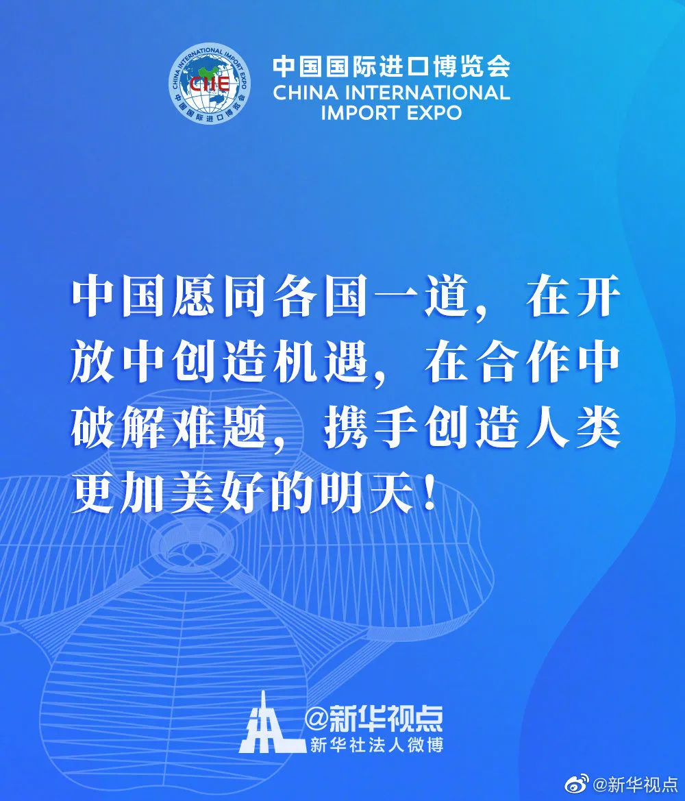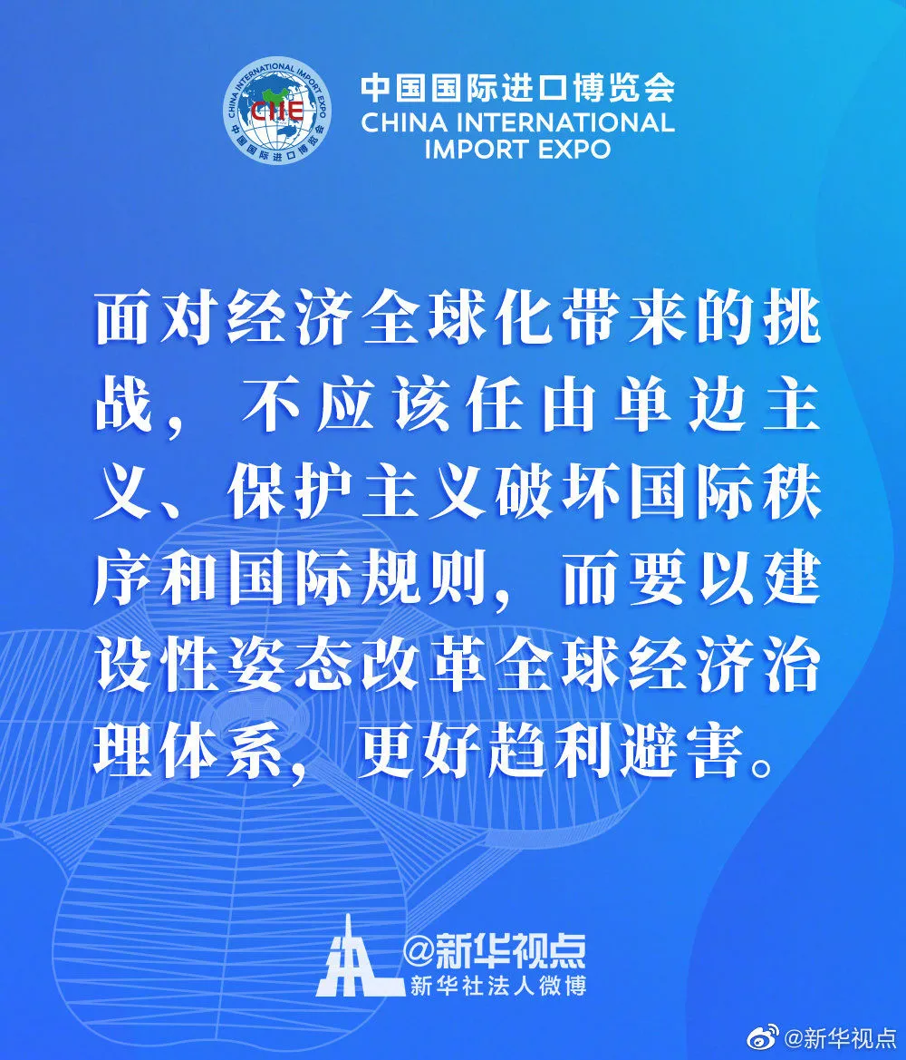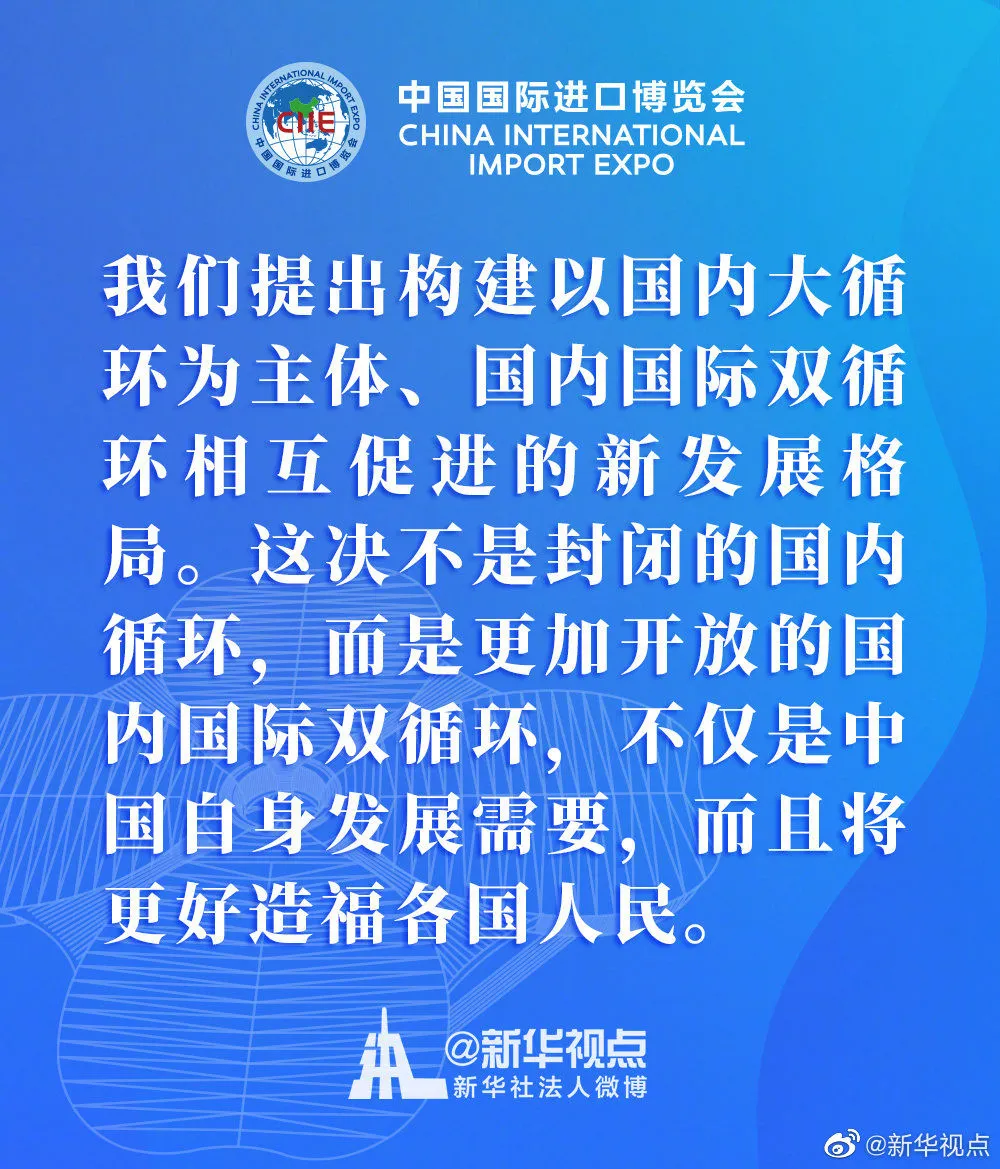习近平指出,本届进博会是在特殊时期举办的。突如其来的新冠肺炎疫情给各国带来严重冲击,也给世界经济带来重创。中国在确保防疫安全前提下如期举办这一全球贸易盛会,体现了中国同世界分享市场机遇、推动世界经济复苏的真诚愿望。 习近平强调,尽管受到疫情影响,今年中国扩大开放的步伐仍在加快。我在第二届进博会上宣布的扩大对外开放系列举措已经全面落实。中国持续扩大进口。海南自由贸易港建设总体方案、深圳进一步扩大改革开放的实施方案发布实施,商签高标准自由贸易协定、培育进口贸易促进创新示范区、保护知识产权、高质量共建“一带一路”等举措都取得了积极进展。 习近平指出,疫情使世界经济不稳定不确定因素增多。从历史上看,不管遇到什么风险、什么灾难、什么逆流,人类社会总是要前进的,而且一定能够继续前进。各国走向开放、走向合作的大势没有改变。我们要携起手来,共同应对风险挑战,共同加强合作沟通,共同扩大对外开放。要致力于推进合作共赢的共同开放,信任而不是猜忌,携手而不是挥拳,协商而不是谩骂。要致力于推进合作共担的共同开放,大国要率先示范,主要经济体要以身作则,发展中国家要积极作为。要致力于推进合作共治的共同开放,不应该任由单边主义、保护主义破坏国际秩序和国际规则,而要以建设性姿态改革全球经济治理体系,推动建设开放型世界经济。 习近平指出,刚刚闭幕的中共十九届五中全会,对中国“十四五”时期发展作出全面规划。中国决胜全面建成小康社会、决战脱贫攻坚的目标即将实现,从明年起将开启全面建设社会主义现代化国家新征程,中国将进入一个新发展阶段。我们提出构建以国内大循环为主体、国内国际双循环相互促进的新发展格局。这决不是封闭的国内循环,而是更加开放的国内国际双循环,不仅是中国自身发展需要,而且将更好造福各国人民。中国是全球最具潜力的大市场。中国制造已经成为全球产业链供应链的重要组成部分,作出了积极贡献。中国广阔的内需市场将继续激发源源不断的创新潜能。中国将坚定不移全面扩大开放,让中国市场成为世界的市场、共享的市场、大家的市场,为国际社会注入更多正能量。 第一,建设开放新高地。中国将有效发挥自由贸易试验区、自由贸易港引领作用,出台跨境服务贸易负面清单,在数字经济、互联网等领域持续扩大开放,深入开展贸易和投资自由化便利化改革创新,推动建设更高水平开放型经济新体制。 第二,促进外贸创新发展。中国将继续通过进博会等开放平台,支持各国企业拓展中国商机。中国将挖掘外贸增长潜力,为推动国际贸易增长、世界经济发展作出积极贡献。中国将推动跨境电商等新业态新模式加快发展,培育外贸新动能。中国将压缩《中国禁止进口限制进口技术目录》,为技术要素跨境自由流动创造良好环境。 第三,持续优化营商环境。中国在疫情后出台的各项纾困惠企政策,对在中国境内注册的企业一视同仁。今年,中国实施外商投资法和相关配套法规,进一步缩减了外商投资准入负面清单。中国将继续完善公开透明的涉外法律体系,强化知识产权保护,维护外资企业合法权益,以优质服务营造更好环境。 第四,深化双边、多边、区域合作。中国愿同更多国家商签高标准自由贸易协定,推动尽快签署区域全面经济伙伴关系协定,加快中欧投资协定、中日韩等自由贸易协定谈判进程,加强同世界高标准自贸区交流互鉴。中国将积极参与世界贸易组织改革,积极参与联合国、二十国集团、亚太经合组织、金砖国家等机制合作。中国将同相关国家高质量共建“一带一路”,推动构建人类命运共同体。 习近平最后指出,中国人常说,“不到长城非好汉”。当前,世界经济发展面临严峻挑战,我们要坚定信心、增强勇气、共克时艰。中国愿同各国一道,在开放中创造机遇,在合作中破解难题,携手创造人类更加美好的明天!