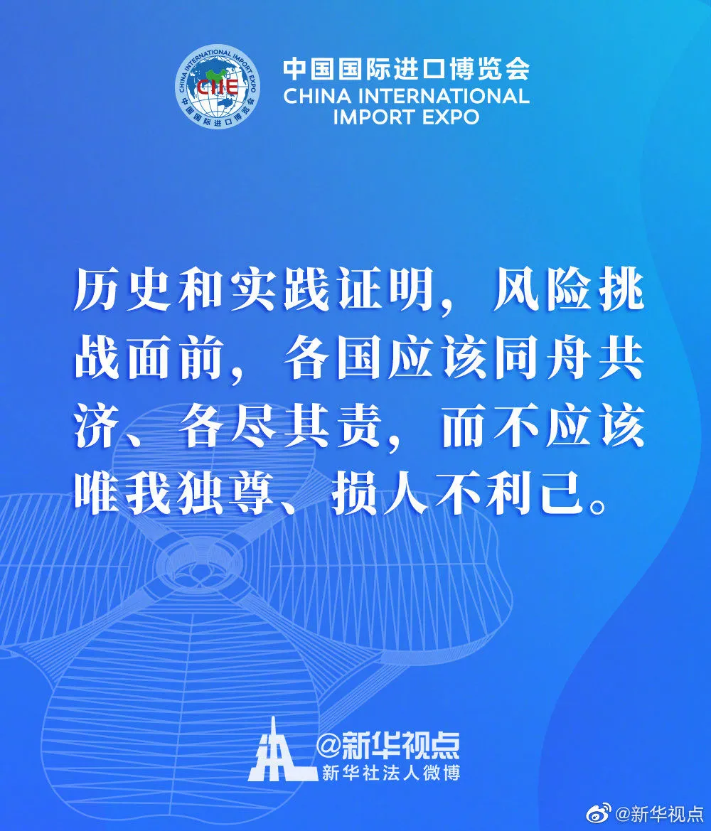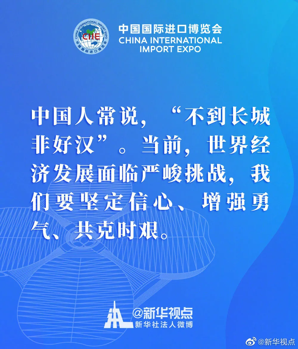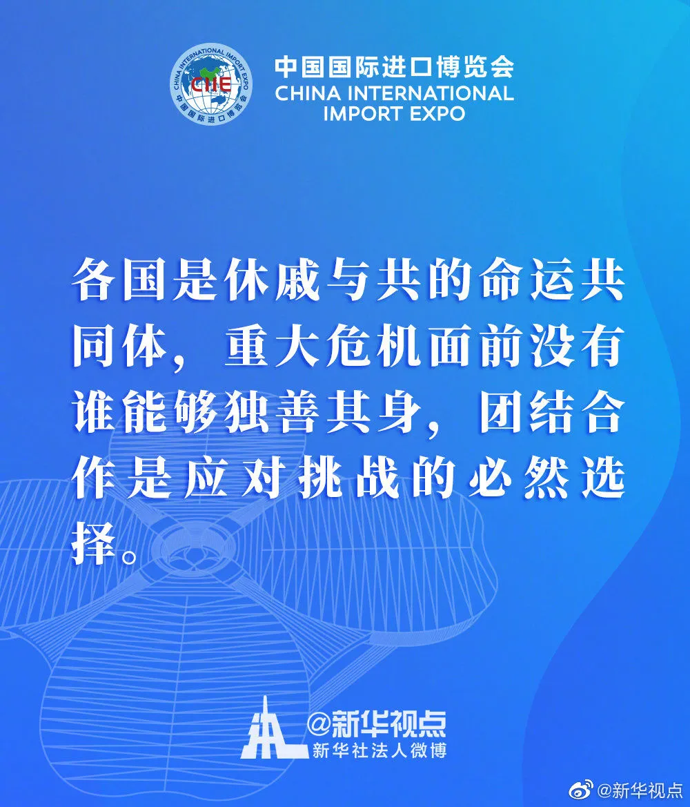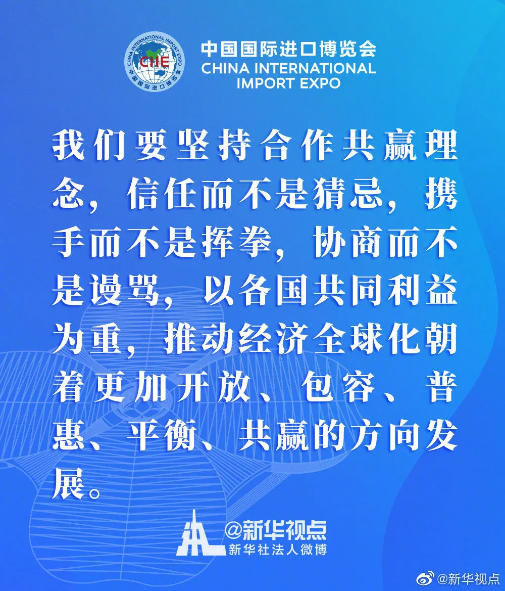 习近平指出,本届进博会是在特殊时期举办的。突如其来的新冠肺炎疫情给各国带来严重冲击,也给世界经济带来重创。中国在确保防疫安全前提下如期举办这一全球贸易盛会,体现了中国同世界分享市场机遇、推动世界经济复苏的真诚愿望。 习近平强调,尽管受到疫情影响,今年中国扩大开放的步伐仍在加快。我在第二届进博会上宣布的扩大对外开放系列举措已经全面落实。中国持续扩大进口。海南自由贸易港建设总体方案、深圳进一步扩大改革开放的实施方案发布实施,商签高标准自由贸易协定、培育进口贸易促进创新示范区、保护知识产权、高质量共建“一带一路”等举措都取得了积极进展。 习近平指出,疫情使世界经济不稳定不确定因素增多。从历史上看,不管遇到什么风险、什么灾难、什么逆流,人类社会总是要前进的,而且一定能够继续前进。各国走向开放、走向合作的大势没有改变。我们要携起手来,共同应对风险挑战,共同加强合作沟通,共同扩大对外开放。要致力于推进合作共赢的共同开放,信任而不是猜忌,携手而不是挥拳,协商而不是谩骂。要致力于推进合作共担的共同开放,大国要率先示范,主要经济体要以身作则,发展中国家要积极作为。要致力于推进合作共治的共同开放,不应该任由单边主义、保护主义破坏国际秩序和国际规则,而要以建设性姿态改革全球经济治理体系,推动建设开放型世界经济。 习近平指出,刚刚闭幕的中共十九届五中全会,对中国“十四五”时期发展作出全面规划。中国决胜全面建成小康社会、决战脱贫攻坚的目标即将实现,从明年起将开启全面建设社会主义现代化国家新征程,中国将进入一个新发展阶段。我们提出构建以国内大循环为主体、国内国际双循环相互促进的新发展格局。这决不是封闭的国内循环,而是更加开放的国内国际双循环,不仅是中国自身发展需要,而且将更好造福各国人民。中国是全球最具潜力的大市场。中国制造已经成为全球产业链供应链的重要组成部分,作出了积极贡献。中国广阔的内需市场将继续激发源源不断的创新潜能。中国将坚定不移全面扩大开放,让中国市场成为世界的市场、共享的市场、大家的市场,为国际社会注入更多正能量。 第一,建设开放新高地。中国将有效发挥自由贸易试验区、自由贸易港引领作用,出台跨境服务贸易负面清单,在数字经济、互联网等领域持续扩大开放,深入开展贸易和投资自由化便利化改革创新,推动建设更高水平开放型经济新体制。 第二,促进外贸创新发展。中国将继续通过进博会等开放平台,支持各国企业拓展中国商机。中国将挖掘外贸增长潜力,为推动国际贸易增长、世界经济发展作出积极贡献。中国将推动跨境电商等新业态新模式加快发展,培育外贸新动能。中国将压缩《中国禁止进口限制进口技术目录》,为技术要素跨境自由流动创造良好环境。 第三,持续优化营商环境。中国在疫情后出台的各项纾困惠企政策,对在中国境内注册的企业一视同仁。今年,中国实施外商投资法和相关配套法规,进一步缩减了外商投资准入负面清单。中国将继续完善公开透明的涉外法律体系,强化知识产权保护,维护外资企业合法权益,以优质服务营造更好环境。 第四,深化双边、多边、区域合作。中国愿同更多国家商签高标准自由贸易协定,推动尽快签署区域全面经济伙伴关系协定,加快中欧投资协定、中日韩等自由贸易协定谈判进程,加强同世界高标准自贸区交流互鉴。中国将积极参与世界贸易组织改革,积极参与联合国、二十国集团、亚太经合组织、金砖国家等机制合作。中国将同相关国家高质量共建“一带一路”,推动构建人类命运共同体。 习近平最后指出,中国人常说,“不到长城非好汉”。当前,世界经济发展面临严峻挑战,我们要坚定信心、增强勇气、共克时艰。中国愿同各国一道,在开放中创造机遇,在合作中破解难题,携手创造人类更加美好的明天!