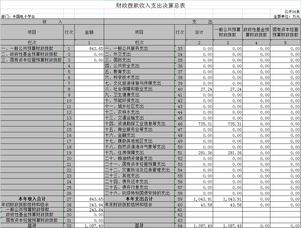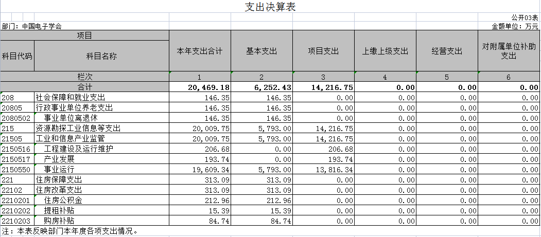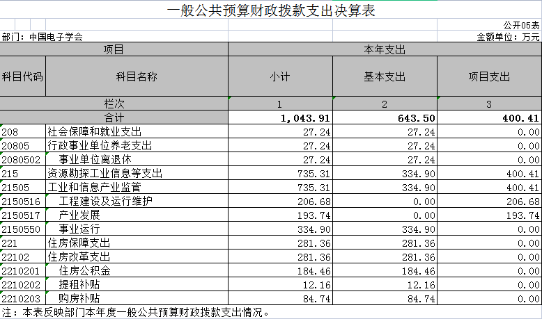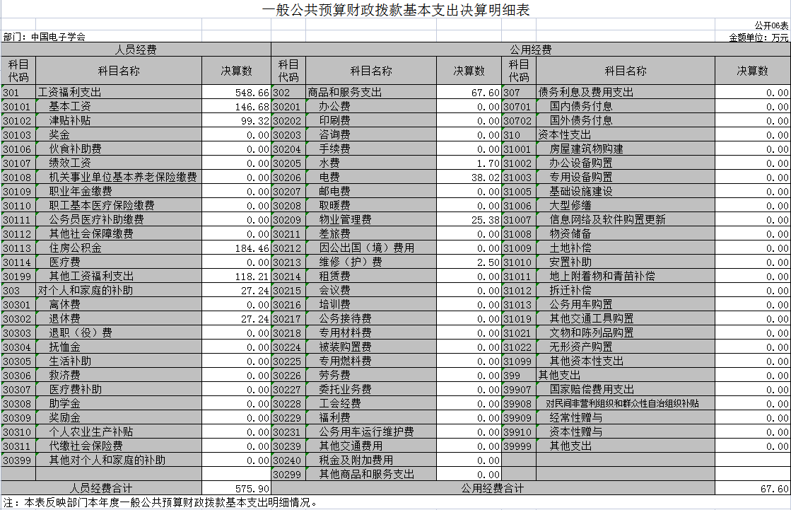 中国电子学会2022年一般公共决算基本支出643.5万元。其中:人员经费575.9万元,主要包括:基本工资、津贴补贴、住房公积金、离休费、退休费、医疗费补助;公用经费67.6万元,主要包括:办公费、印刷费、咨询费、水费、电费、物业管理费、差旅费、维修(护)费、租赁费、委托业务费、其他商品和服务支出。