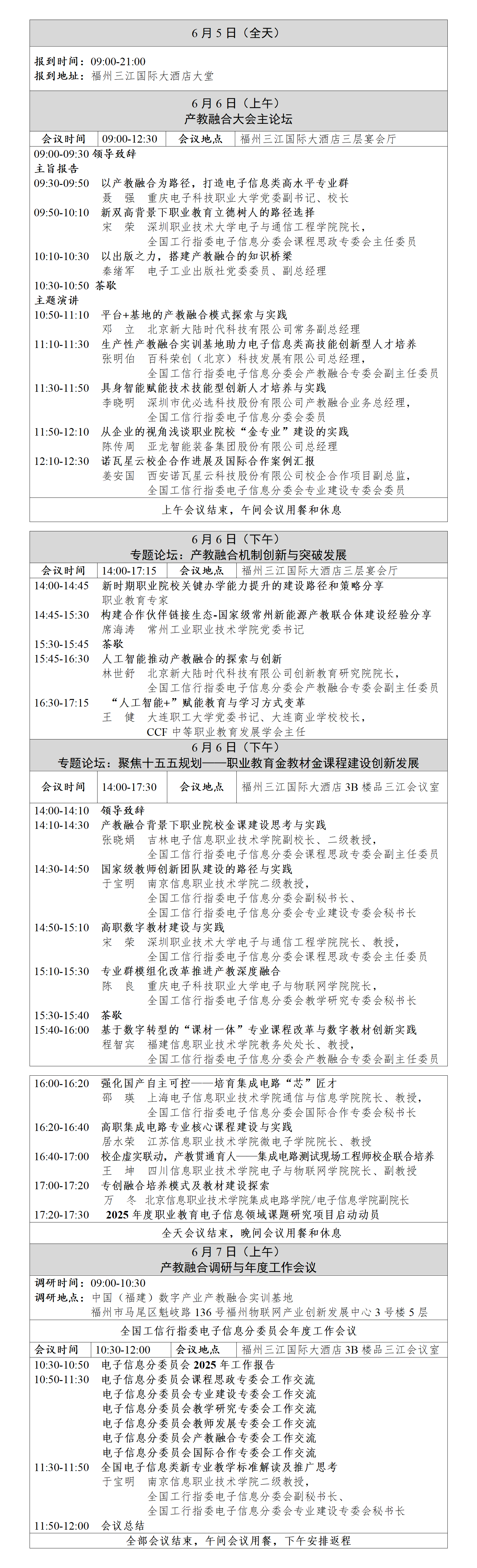 为贯彻党中央关于职业教育工作的决策部署和习近平总书记有关重要指示批示精神,落实《关于深化现代职业教育体系建设改革的意见》和《教育强国建设规划纲要(2024-2035年)》中关于加快建设现代职业教育体系的总体要求,推进《职业教育产教融合赋能提升行动实施方案(2023-2025年)》,全国工业和信息化职业教育教学指导委员会电子信息分委员会将以“协同开放·守正创新”为主题,定于6月5日至6月7日在福州组织举办2025新一代信息技术产业产教融合大会暨职业院校电子信息类学院院长和系主任年会(以下简称“大会”),面向全国职业院校、重点企业、科研机构、出版社等相关单位,持续着力打造专业化、特色化的交流合作大平台。报名通道现已正式开启,具体通知如下。