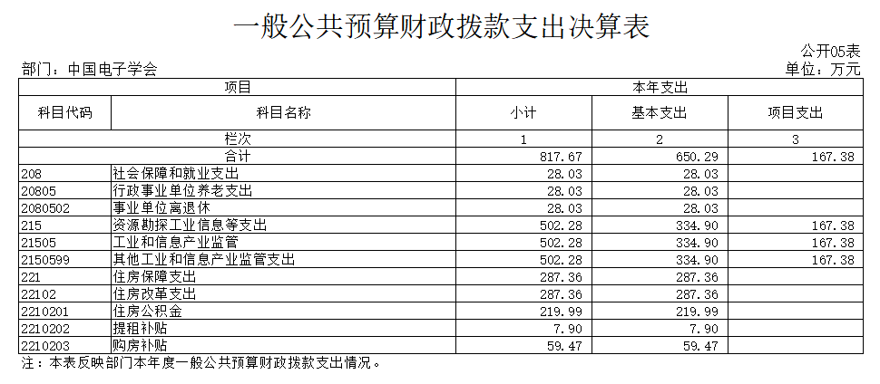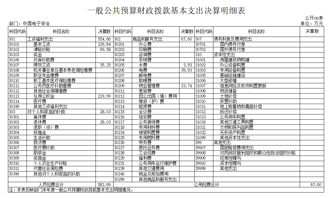 中国电子学会 2024年度一般公共预算财政拨款基本支出650.29万元。其中,人员经费582.69万元,主要包括:基本工资、津贴补贴、住房公积金、退休费、绩效工资;公用经费67.6万元,主要包括:水费、电费、物业管理费。