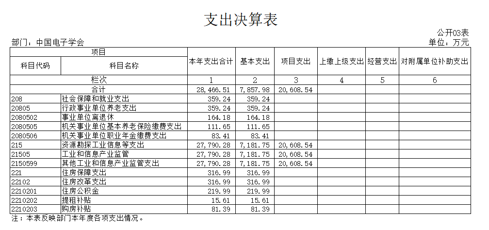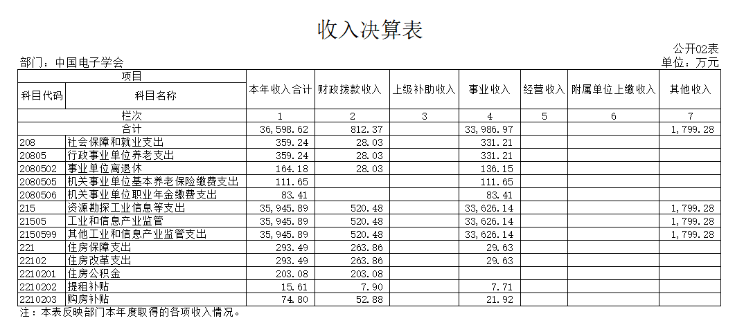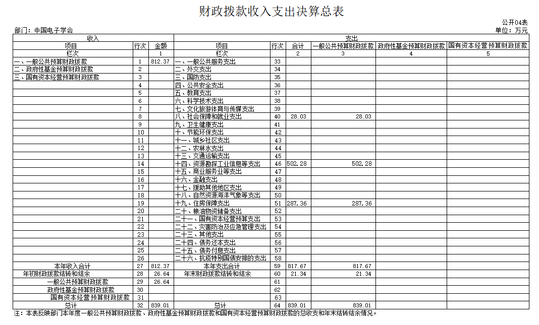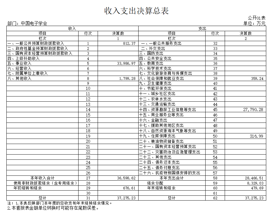 2024年度中国电子学会收、支总计37275.23 万元,收入主要构成为:一般公共预算财政拨款收入812.37万元、事业收入33986.97万元、其他收入1799.28万元、年初结转和结余676.61万元;支出主要构成为:社会保障和就业支出359.24万元、资源勘探工业信息等支出27790.28万元、住房保障支出316.99万元、结余分配8329.03万元、年末结转和结余479.69万元。
