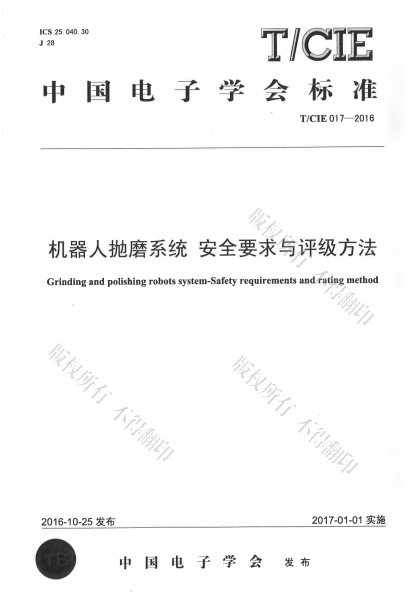 2016年10月25日,由中国电子学会机器人标准化技术委员会提出并归口,中国电子学会联合重庆德新机器人检测中心有限公司、中国科学院重庆绿色智能技术研究院等单位研制的机器人团体标准《机器人抛磨系统安全要求与评级方法》正式发布。该标准标准号为T/CIE 017-2016,现通过中国电子技术标准化研究院正式发行。机器人行业的从业者可通过中国电子学会或中国电子技术标准化研究院订购该标准。该团体标准版权归中国电子学会所有,特此通知。