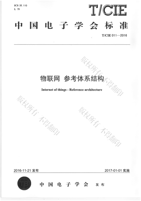 2016年11月21日,由中国电子学会物联网标准化技术委员会提出并归口,中国电子学会联合中国电子技术标准化研究院、利达尔科技有限公司等单位研制的物联网团体标准《物联网参考体系结构》正式发布。该标准标准号为T/CIE 011-2016,现通过中国电子技术标准化研究院正式发行。物联网行业的从业者可通过中国电子学会或中国电子技术标准化研究院订购该标准。该团体标准版权归中国电子学会所有,特此通知。
