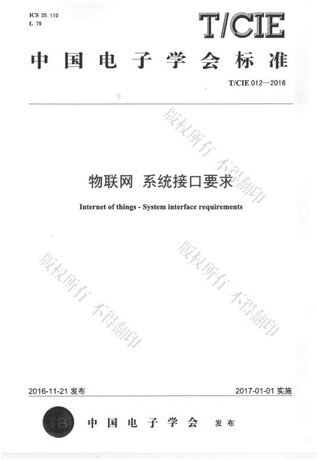 2016年11月21日,由中国电子学会物联网标准化技术委员会提出并归口,中国电子学会联合无锡物联网产业研究院、中国电子技术标准化研究院、深圳市标准技术研究院等单位研制的物联网团体标准《物联网系统接口要求》正式发布。该标准标准号为T/CIE 012-2016,现通过中国电子技术标准化研究院正式发行。物联网行业的从业者可通过中国电子学会或中国电子技术标准化研究院订购该标准。该团体标准版权归中国电子学会所有,特此通知。
